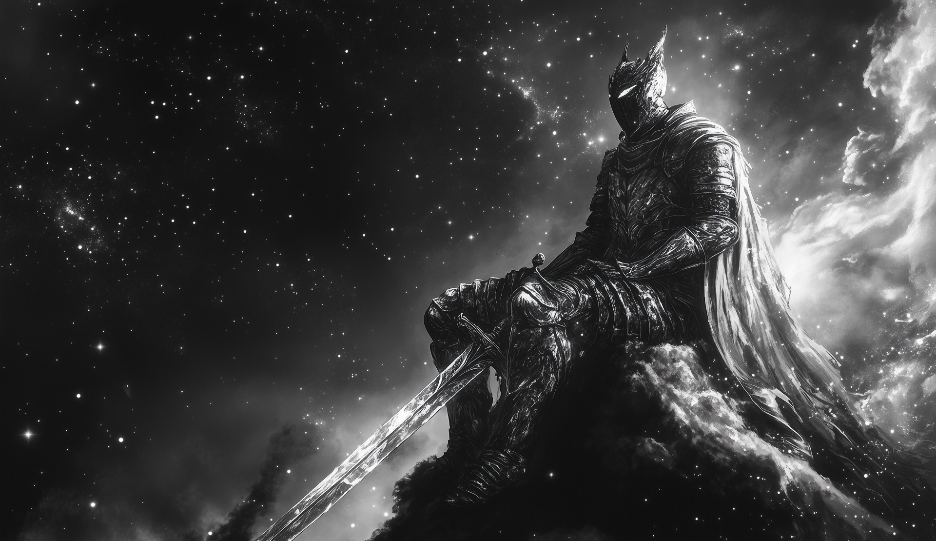 This illustration features a monochrome depiction of a knight, striking a powerful pose as he sits upon his large sword. The background suggests an ethereal space scene, enhancing the mystical vibe of the character.