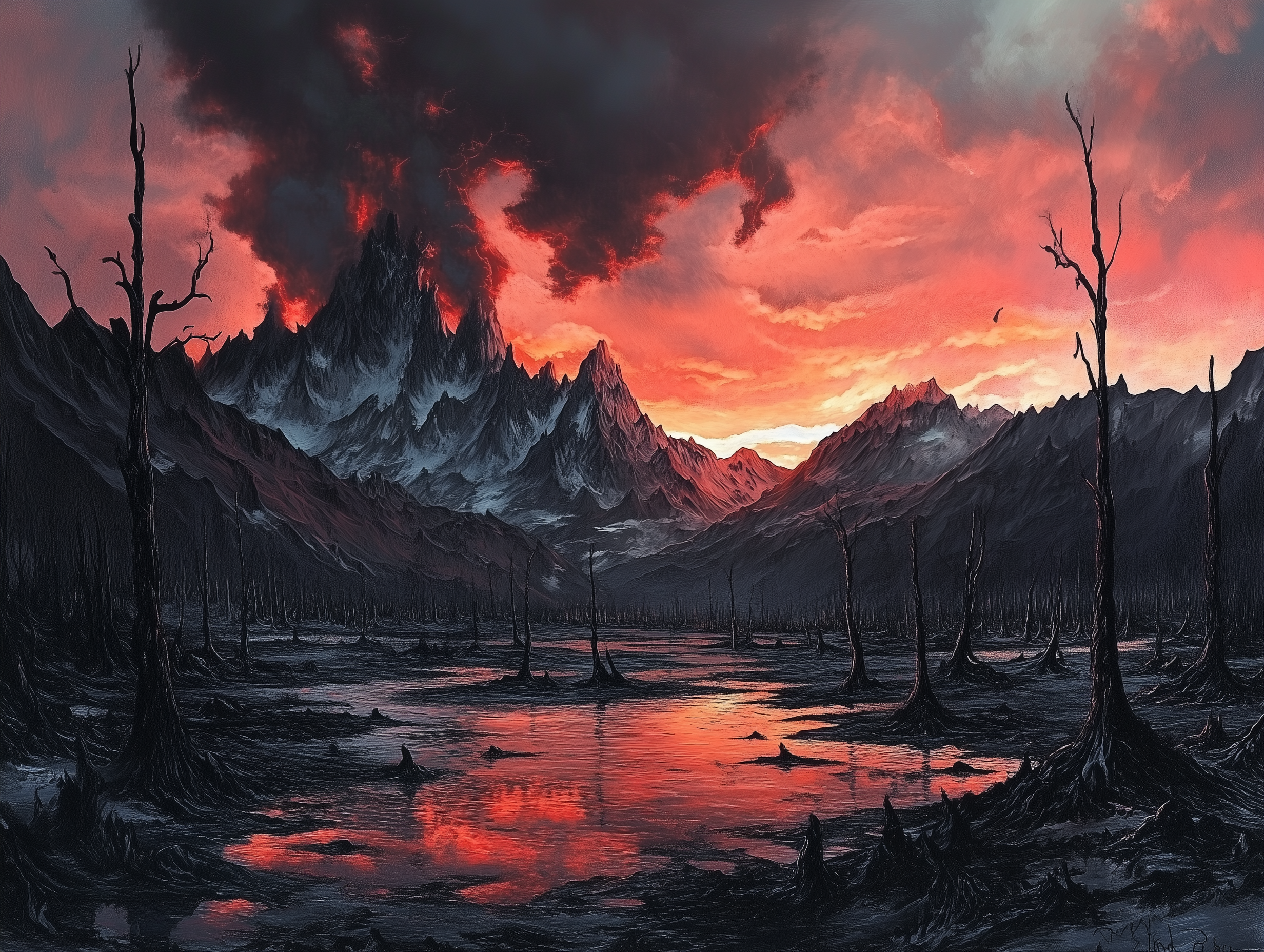 The image portrays an enchanting black marshland, shrouded in a mystical atmosphere. Dead black trees rise eerily against a backdrop of towering mountains, creating a sense of solitude and intrigue.