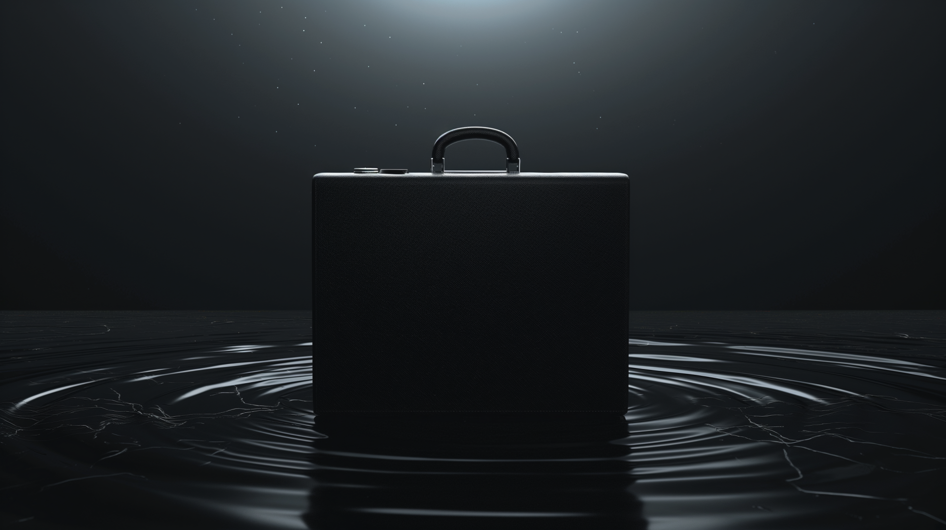 The image features a black briefcase perfectly centered in a vast, dark space. Surrounding the briefcase are refined black rings, resembling flowing dark metal or smoke, creating a harmonious and structured environment.