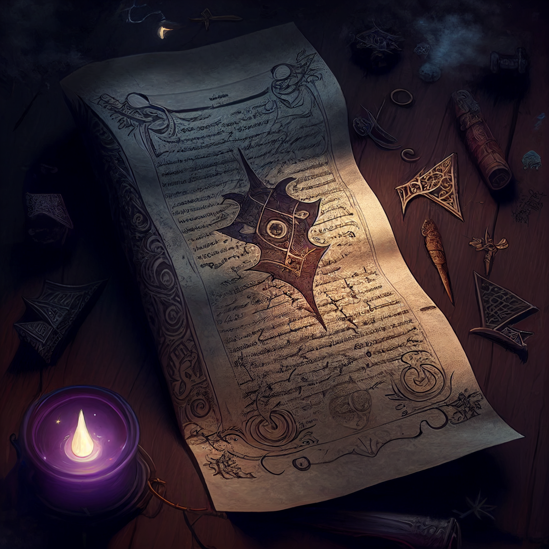 The image features an intricately designed scroll adorned with mystical runes and arcane symbols associated with darkness. The fantasy art style enhances the mysterious aura, inviting viewers into a world of magic and adventure.