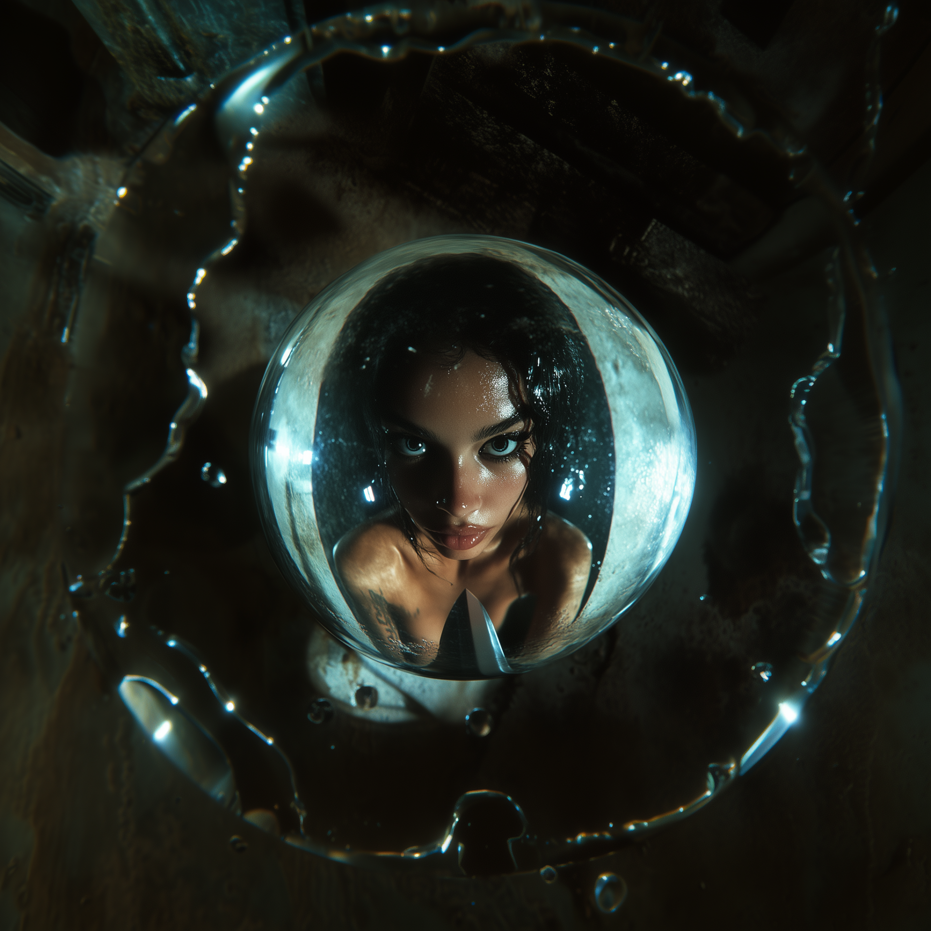 The image depicts a mythical woman with an alluring and mysterious aura, embodying a blend of darkness and urban style. Her captivating eyes resemble those of a cat, enhancing her enigmatic presence.