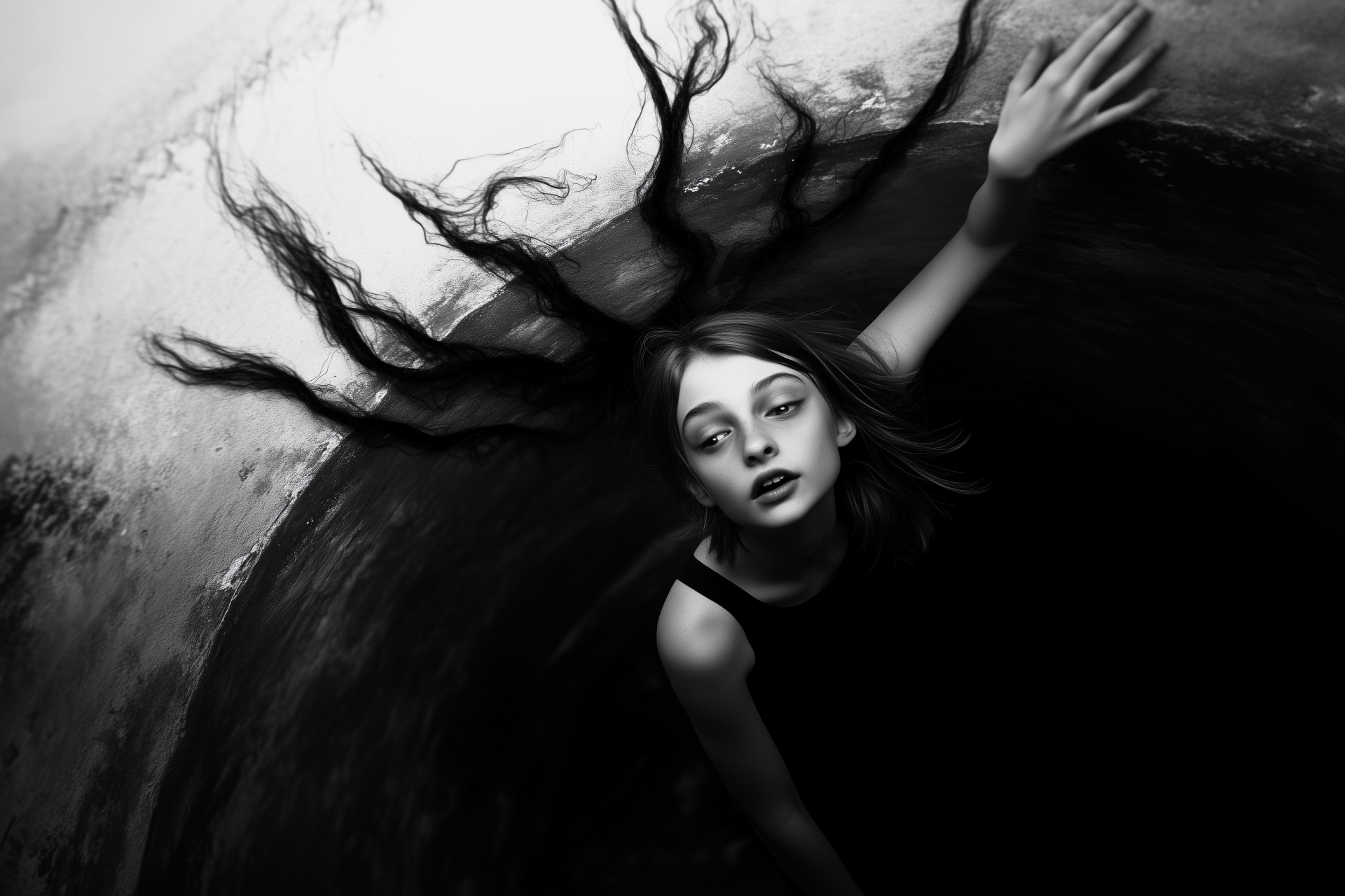 This striking black and white photo captures a tense moment as a girl leans over the edge of a well, peering into its depths. The dark tentacles emerging from the well create a haunting contrast against the girl's pale features, evoking a sense of both curiosity and dread.