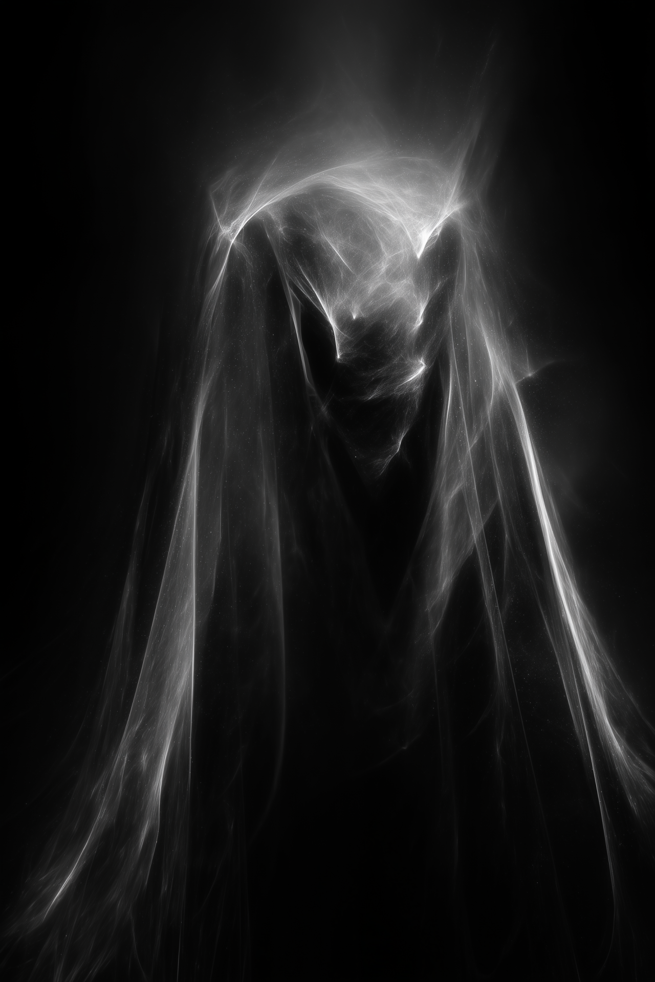 This image depicts a formless entity enveloped in an endless black void, giving off a sense of deep unease. Its shifting dark folds create a surreal atmosphere that embodies feelings of despair and emptiness.