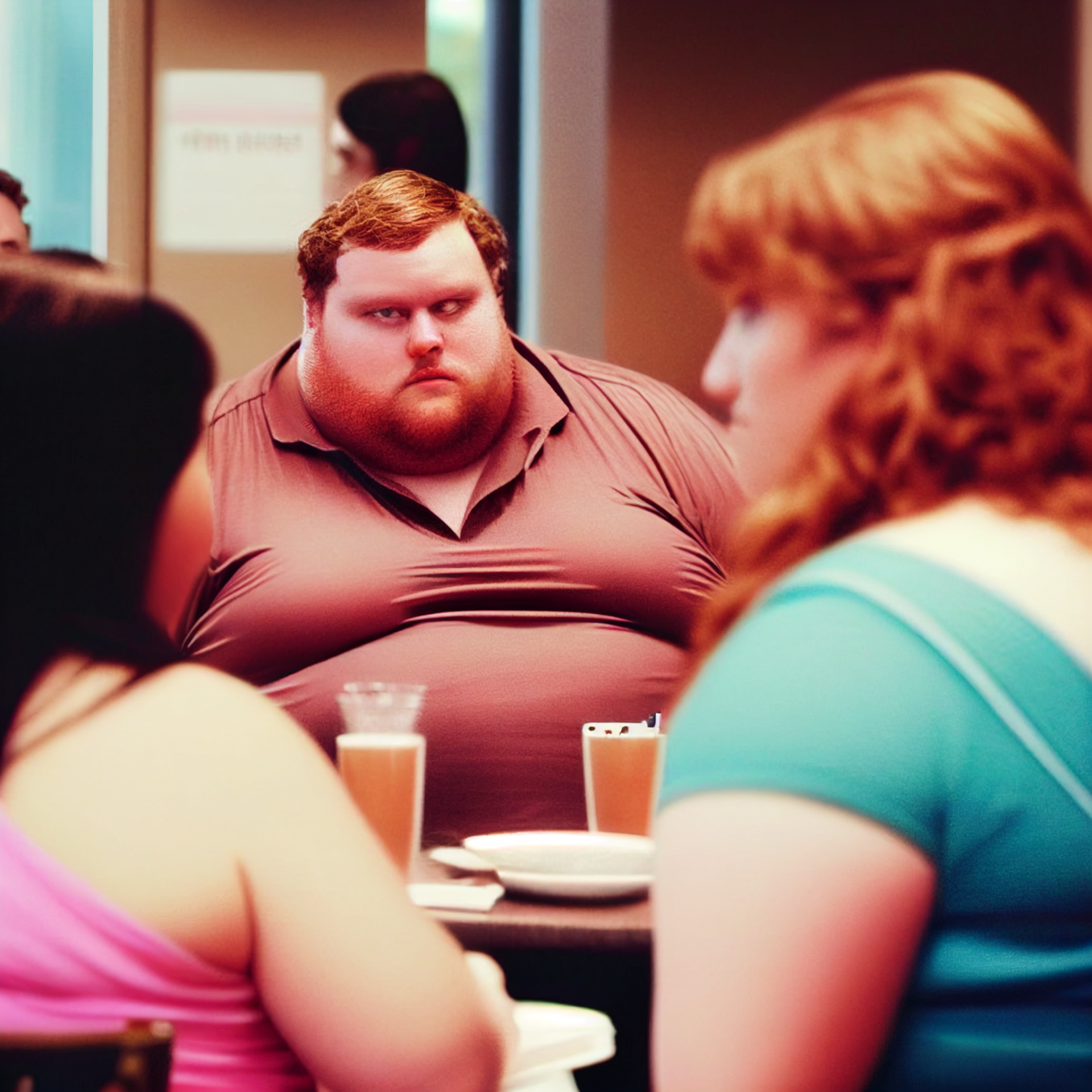 The image captures a lively speed dating event featuring a plus sized man engaging with a diverse group of women. The atmosphere is filled with excitement and anticipation, highlighting the various interactions and conversations taking place.
