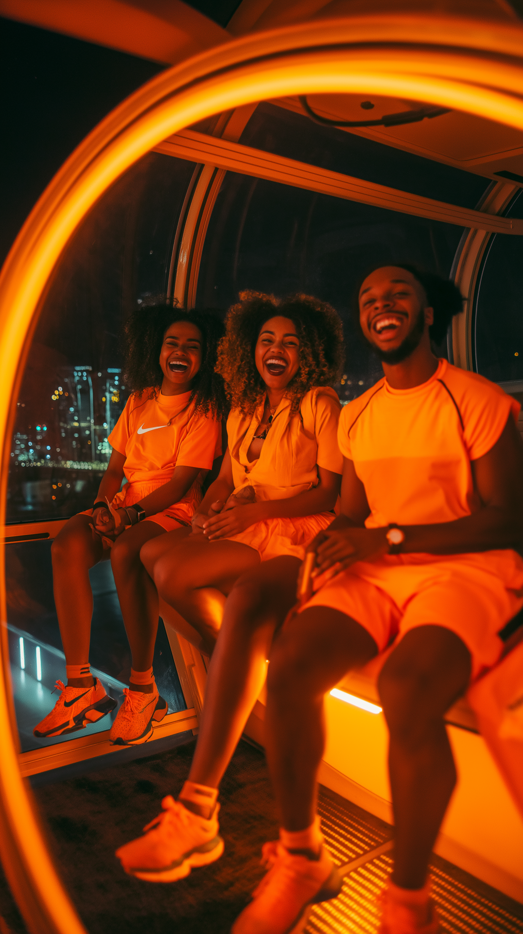 A group of three young influencers is enjoying a night ride in a illuminated pod of the London Eye. Their laughter and vibrant orange clothing create a lively atmosphere against the soft glow of the pod's lighting.