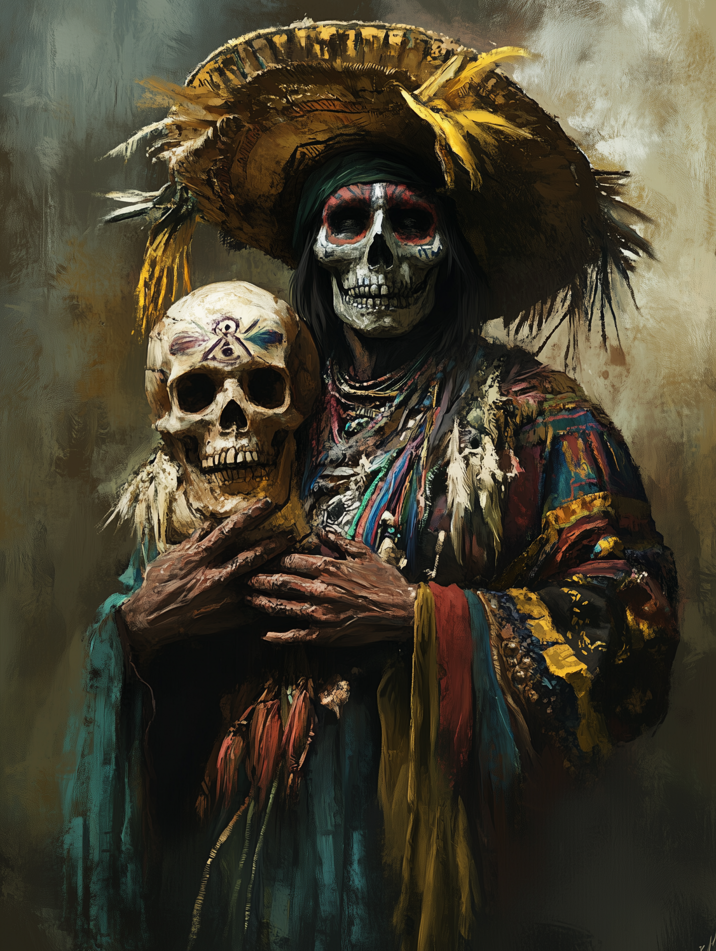 The image features a vibrant illustration of a Mexican figure adorned in traditional Day of the Dead attire. With a hoco-style face and a skull held in hand, the artwork encapsulates the theme of remembrance and celebration of life.