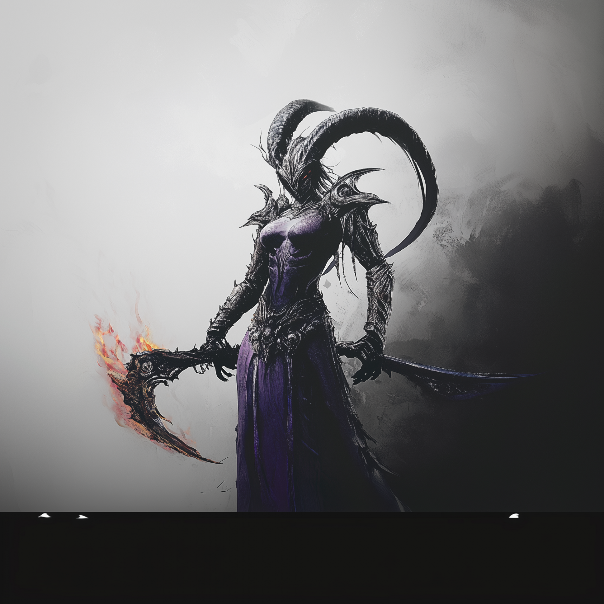 This image showcases a female demonic samurai with a sleek design, highlighting her feminine curves and elaborate armor. The art is infused with themes of shadow and flame, creating a mesmerizing and darkly elegant atmosphere.