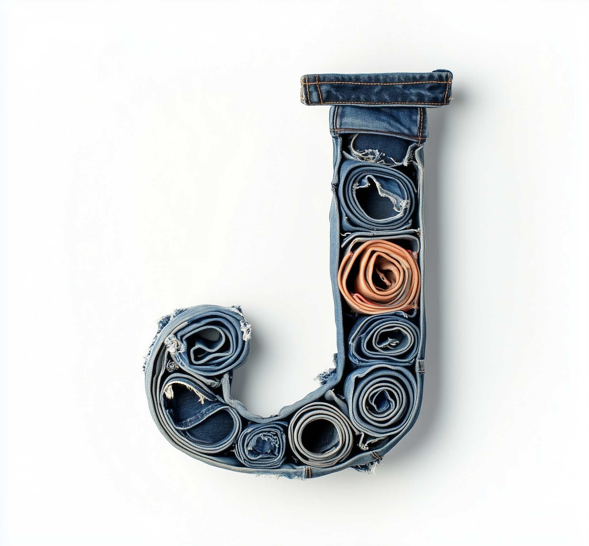 A creative representation of the letter 'J' made from rolled denim placed on a clean white background. The high-resolution image captures the texture and details of the denim with studio lighting enhancing its features.