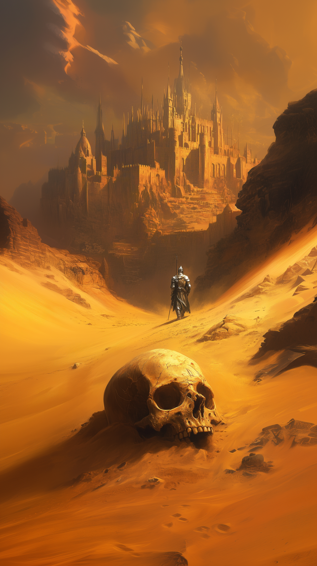 The image presents an ancient skull resting on its side in a sandy foreground, evoking a sense of age and mystery. In the background, a vast desert is illuminated by golden sunlight, featuring a knight in silver armor approaching a medieval castle, capturing a surreal and haunting atmosphere.