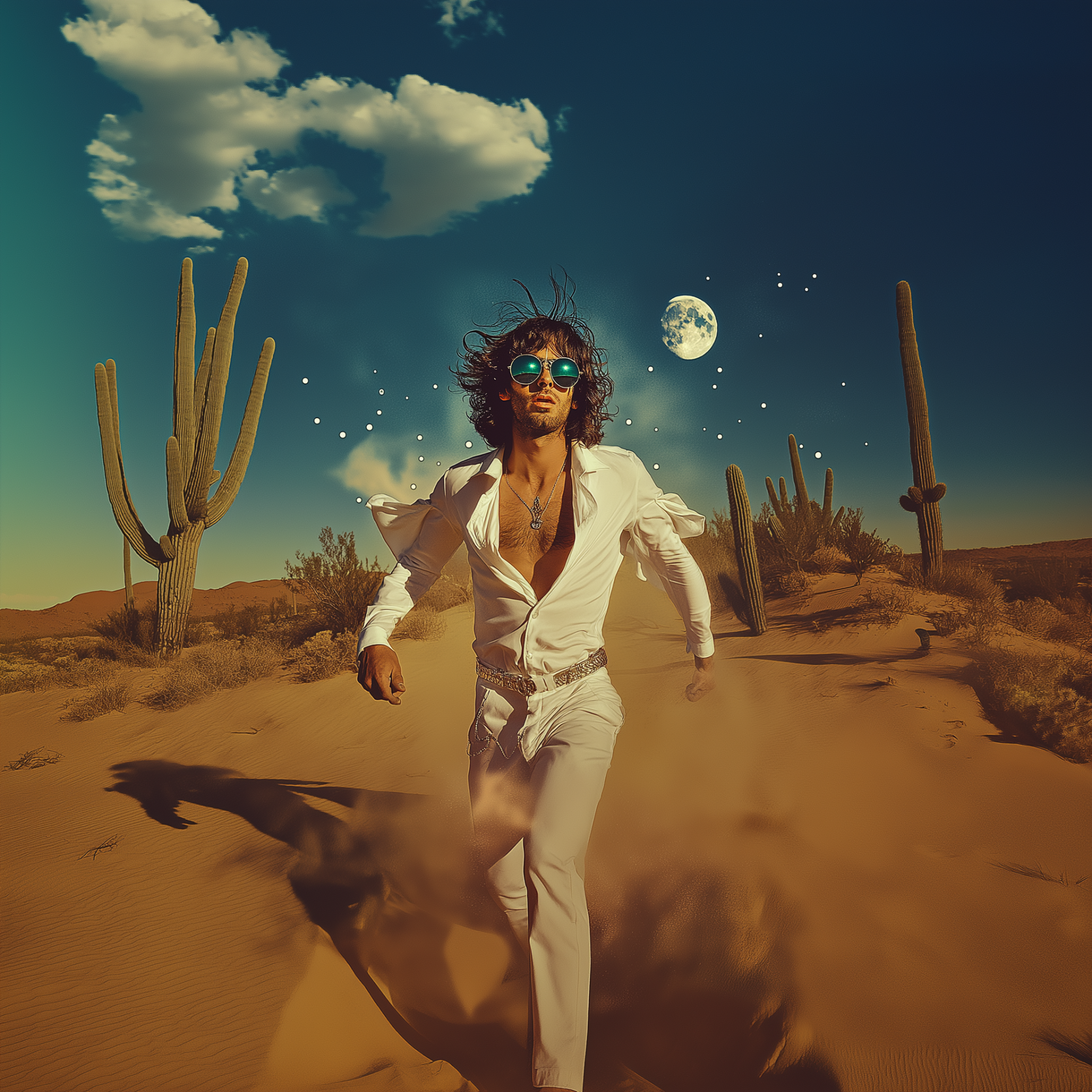 This photorealistic image captures a figure in a white shirt standing in a vibrant desert landscape. The reflection in his sunglasses hints at a mystical experience, while the moon and stars add a surreal atmosphere to the scene.
