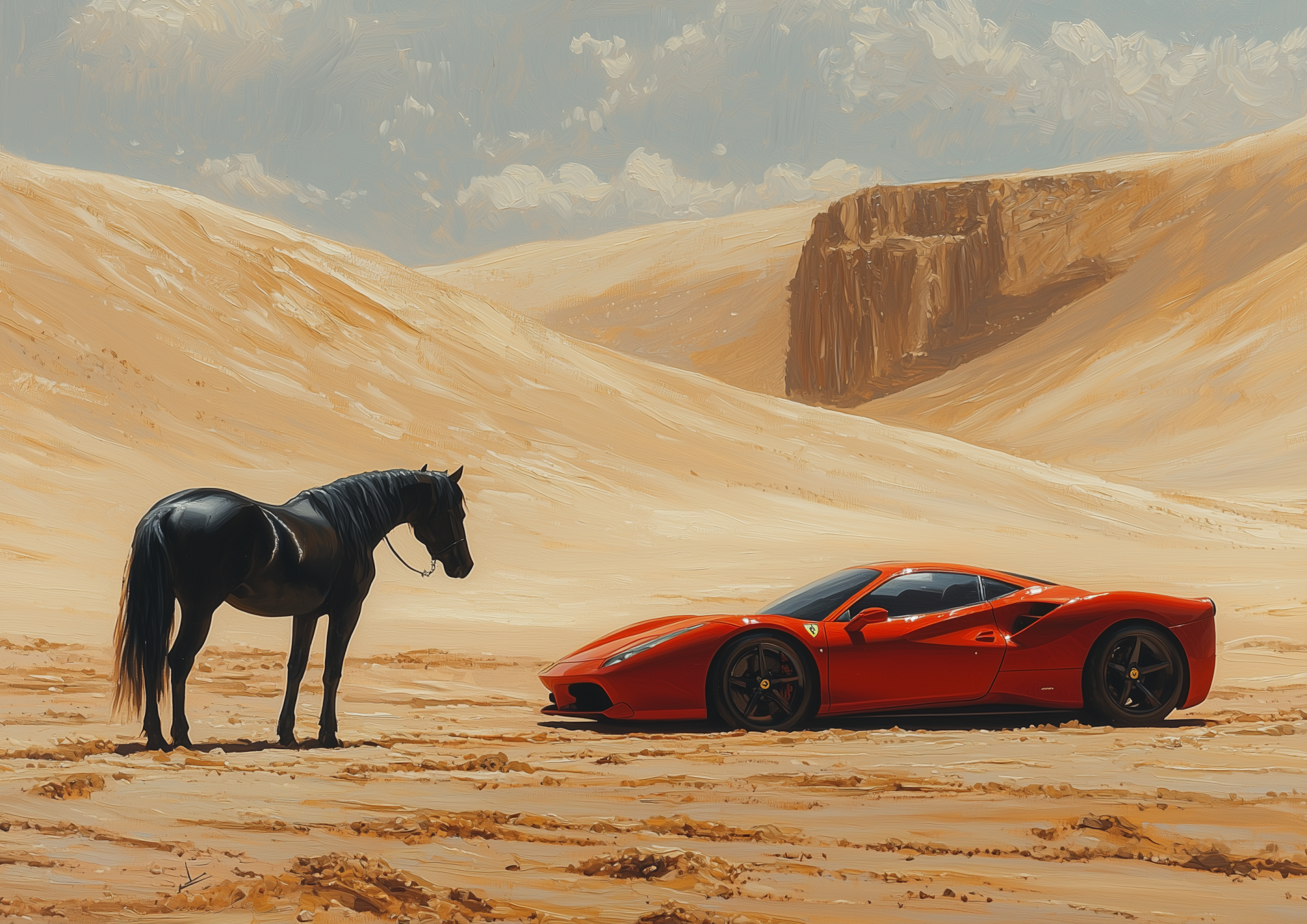 This vibrant image showcases a striking red Ferrari parked in a stark desert landscape alongside a majestic black horse. The contrasting colors and elements create a sense of luxury and freedom amidst a wild backdrop.