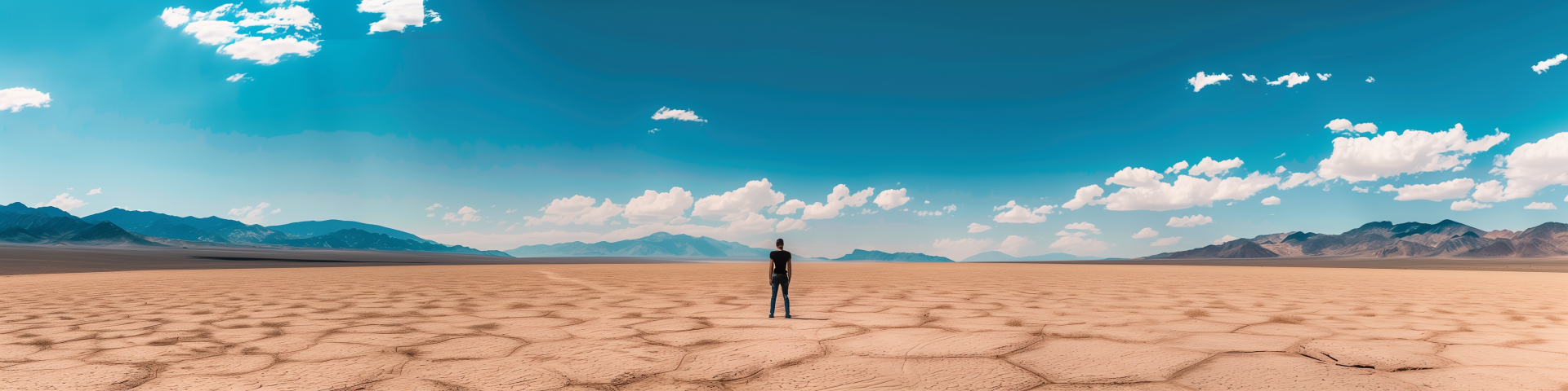 A photorealistic image depicting a lone figure standing in the middle of a vast desert. The scene captures the stark beauty of the arid landscape with dunes stretching into the horizon under a clear blue sky.