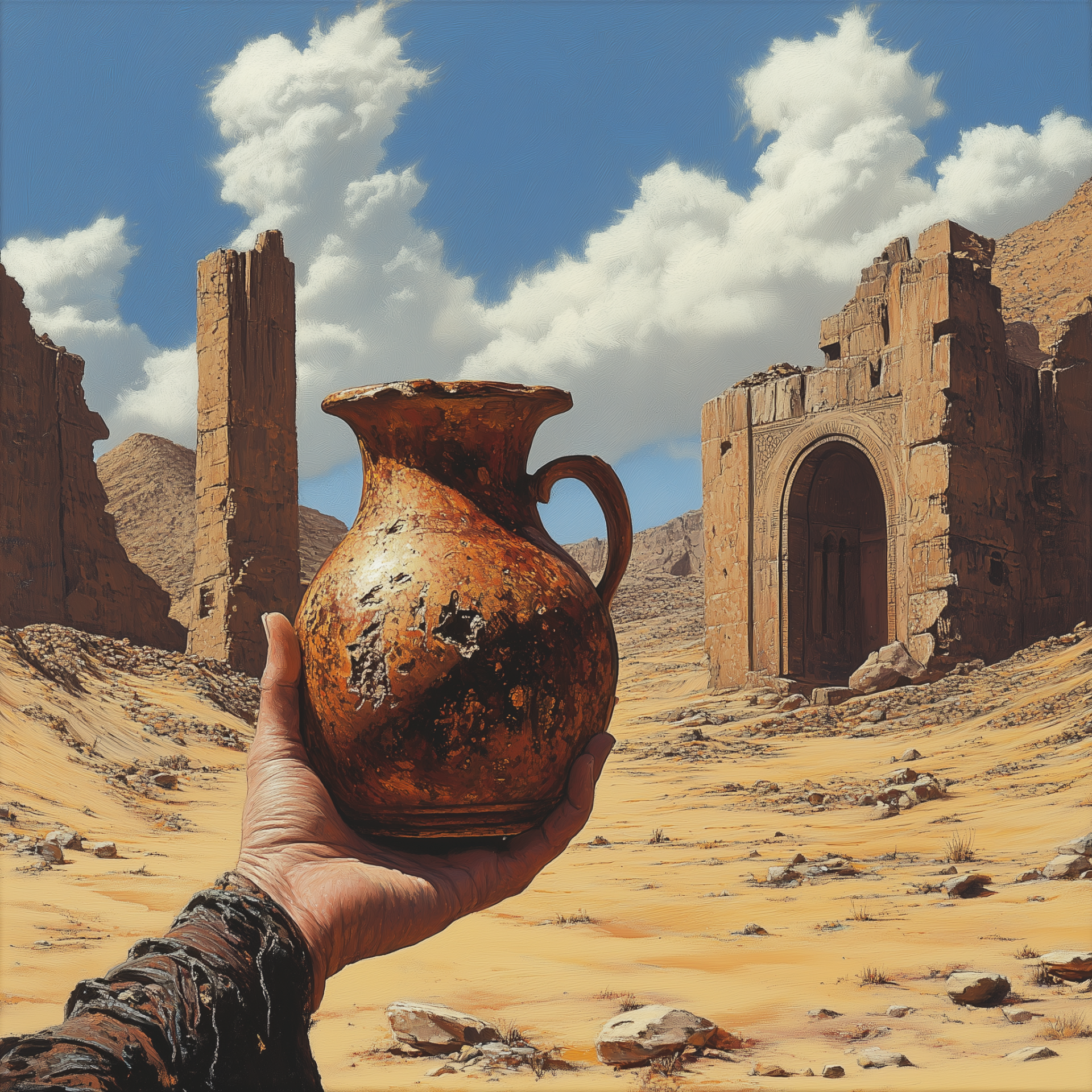 The image captures a hand holding an ancient jug, elevated against a backdrop of vast sand dunes and historic ruins. Sunlight casts warm tones over the scene, evoking a sense of mystery and timelessness.