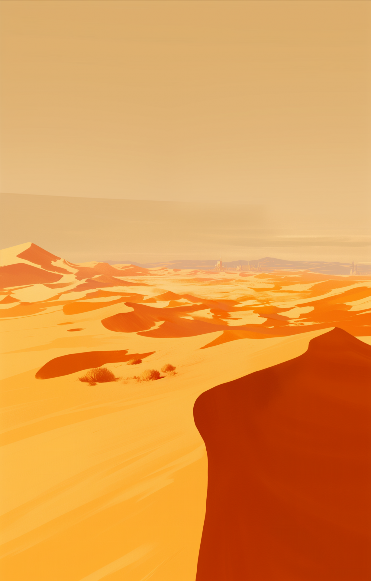 This image showcases an expansive view of red sand dunes under a stark and somber sky. The vast, barren landscape evokes feelings of desolation and otherworldliness.