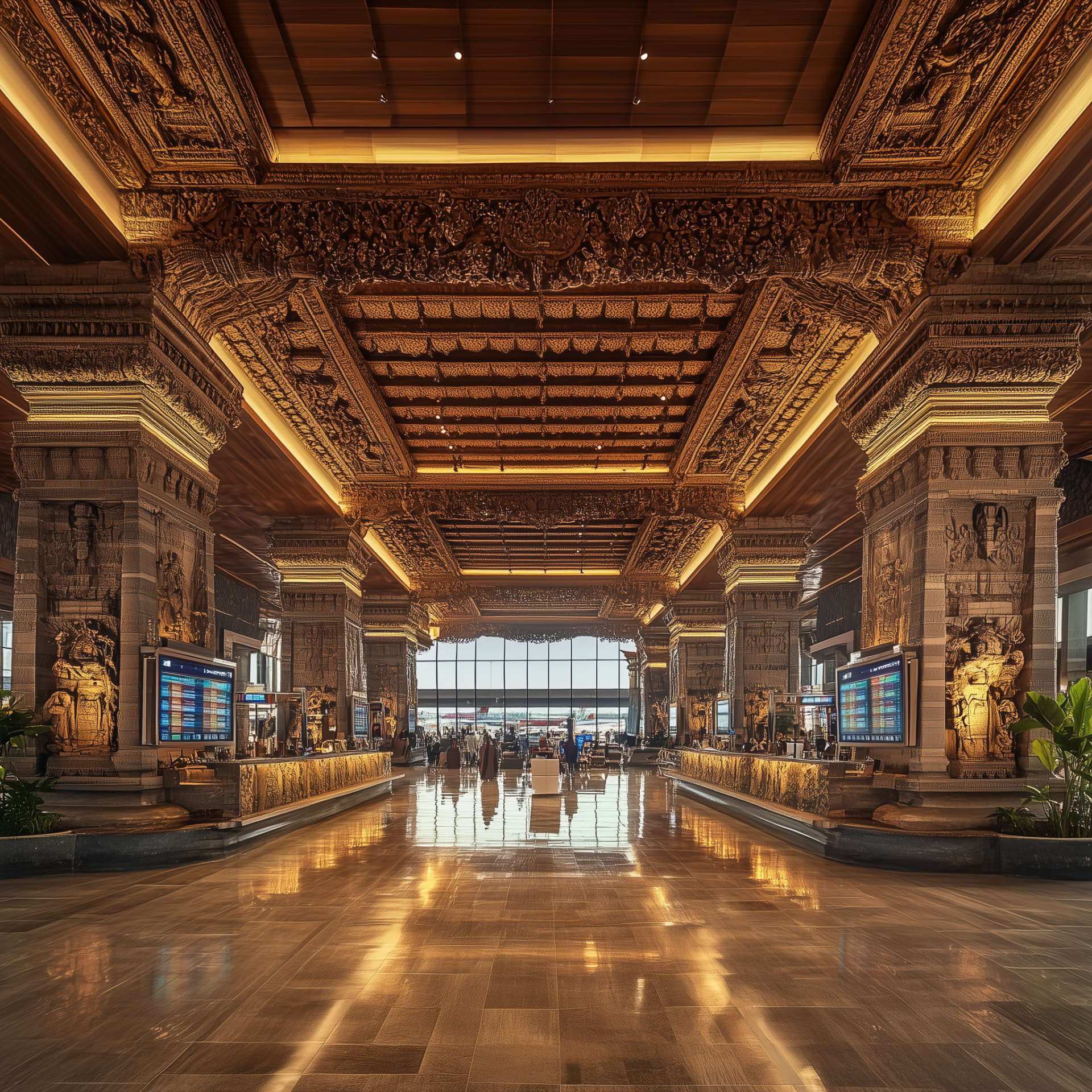 This illustration showcases a grand airport terminal that draws inspiration from ancient architectural styles. The use of volcanic stone and sandstone creates a stunning visual that blends historical elegance with modern functionality.
