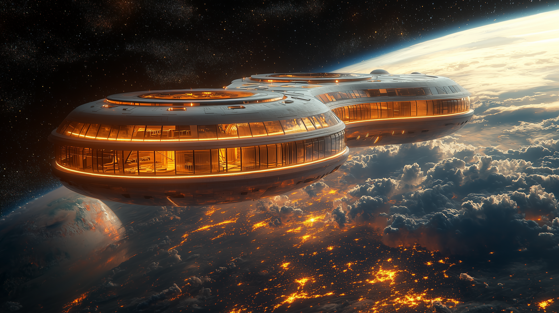 The image portrays a breathtaking hotel suspended in space, featuring sleek, minimalist architecture reminiscent of contemporary tech design. Earth looms beautifully in the background, adding to the magnificent ambiance of the scene.