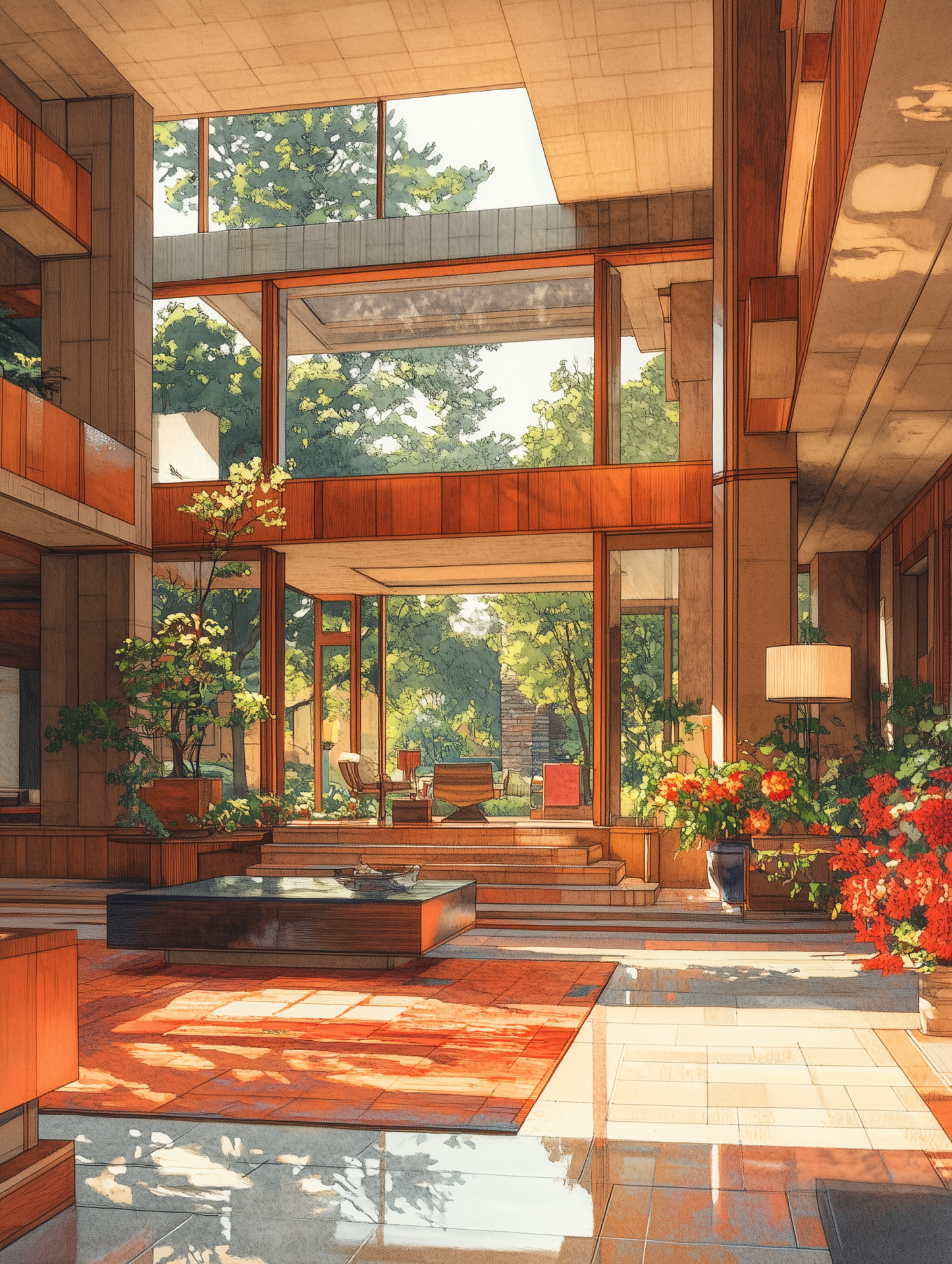 The illustration captures the unique architectural elements and organic design typical of Frank Lloyd Wright's homes. Warm earth tones and flowing lines create a harmonious and inviting space.