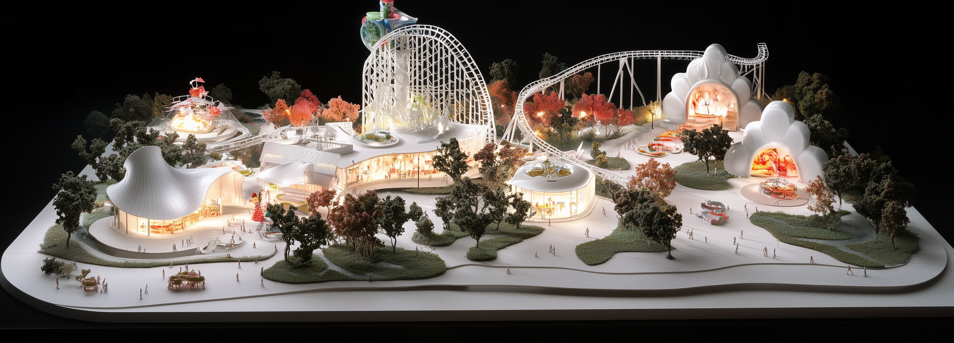 This image showcases a carefully crafted architectural model of a whimsical theme park. The model features unique attractions with a playful design, capturing the essence of fun and creativity.
