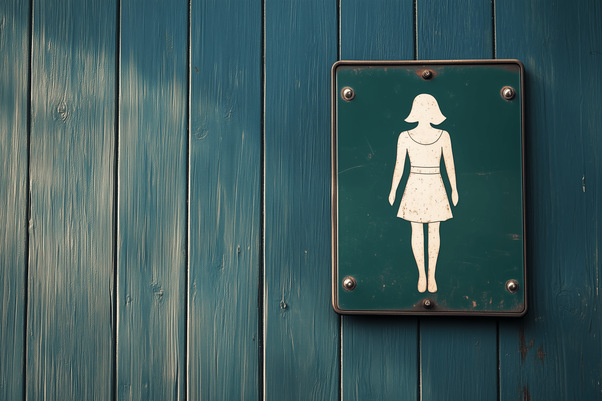 This image features a sign indicating a women's restroom, set against a vibrant green background. The simplistic design showcases a white silhouette of a woman, conveying a sense of clarity and purpose.