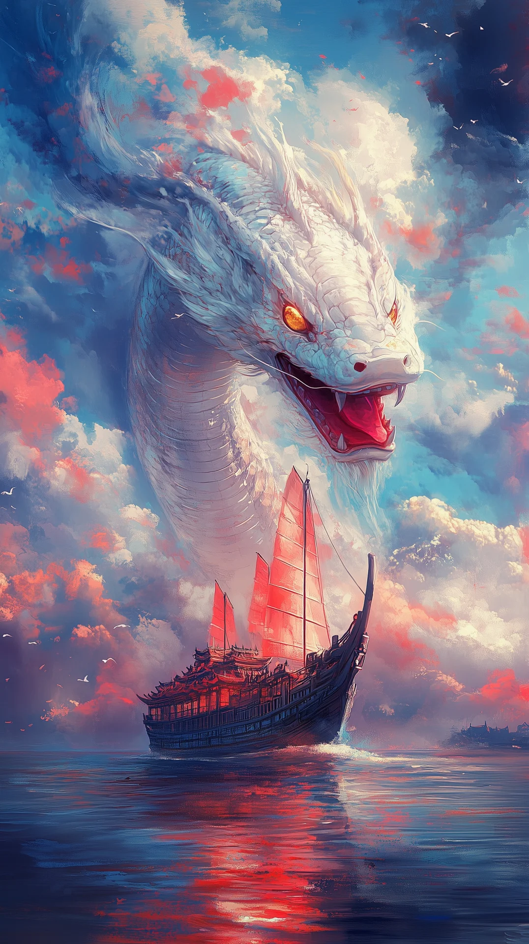 This illustration showcases a vibrant Chinese lion dance head featuring a striking white and red color scheme with gold accents. The cyberpunk style brings a modern twist to the traditional design, set against an artistic ink painting background that enhances the festive atmosphere.