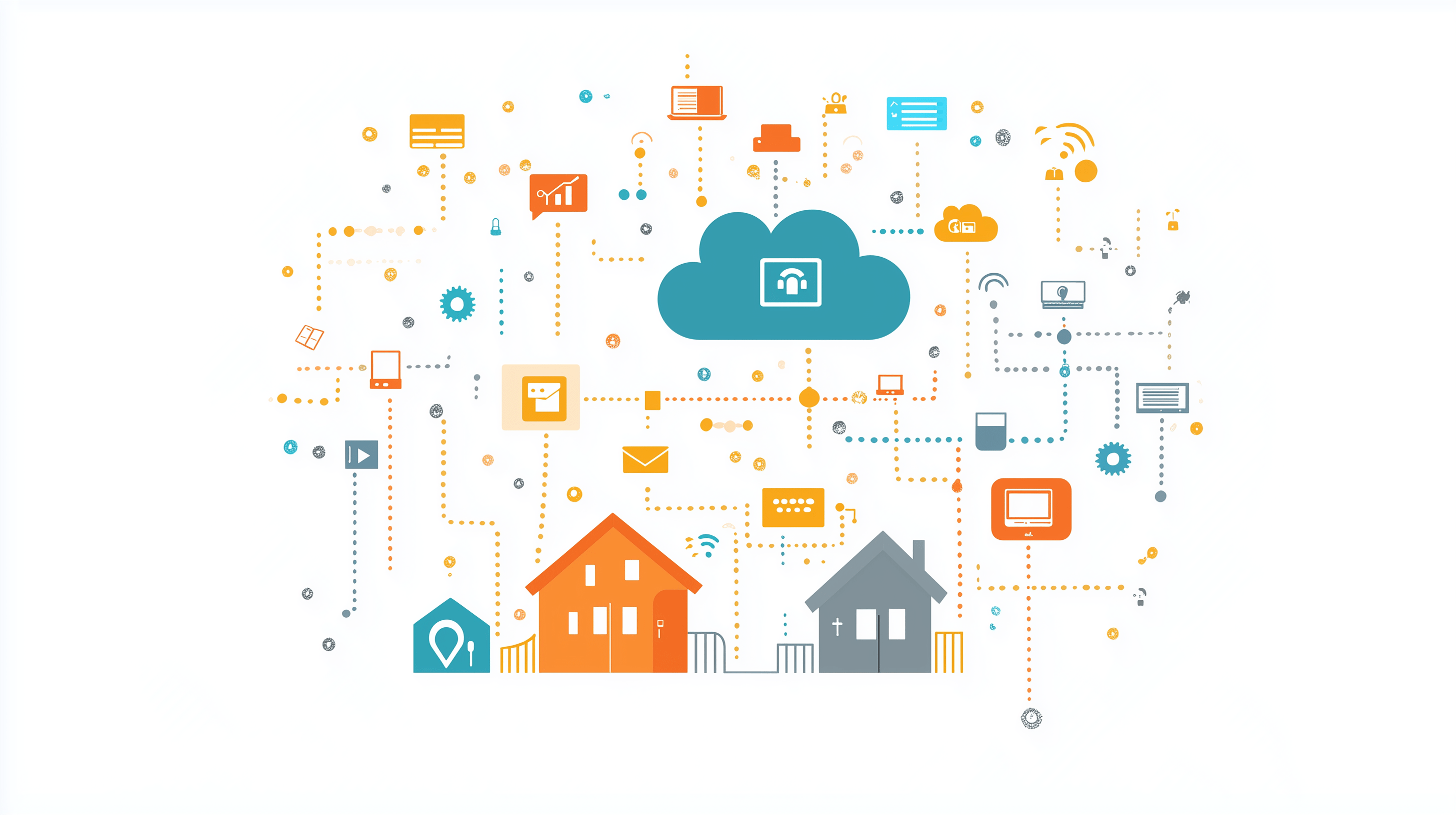 This image features minimalistic digital buildings represented with simple lines, connecting to a schematic cloud. It illustrates the concept of multiple users accessing a common data environment, creating a sense of connectivity and modernity.