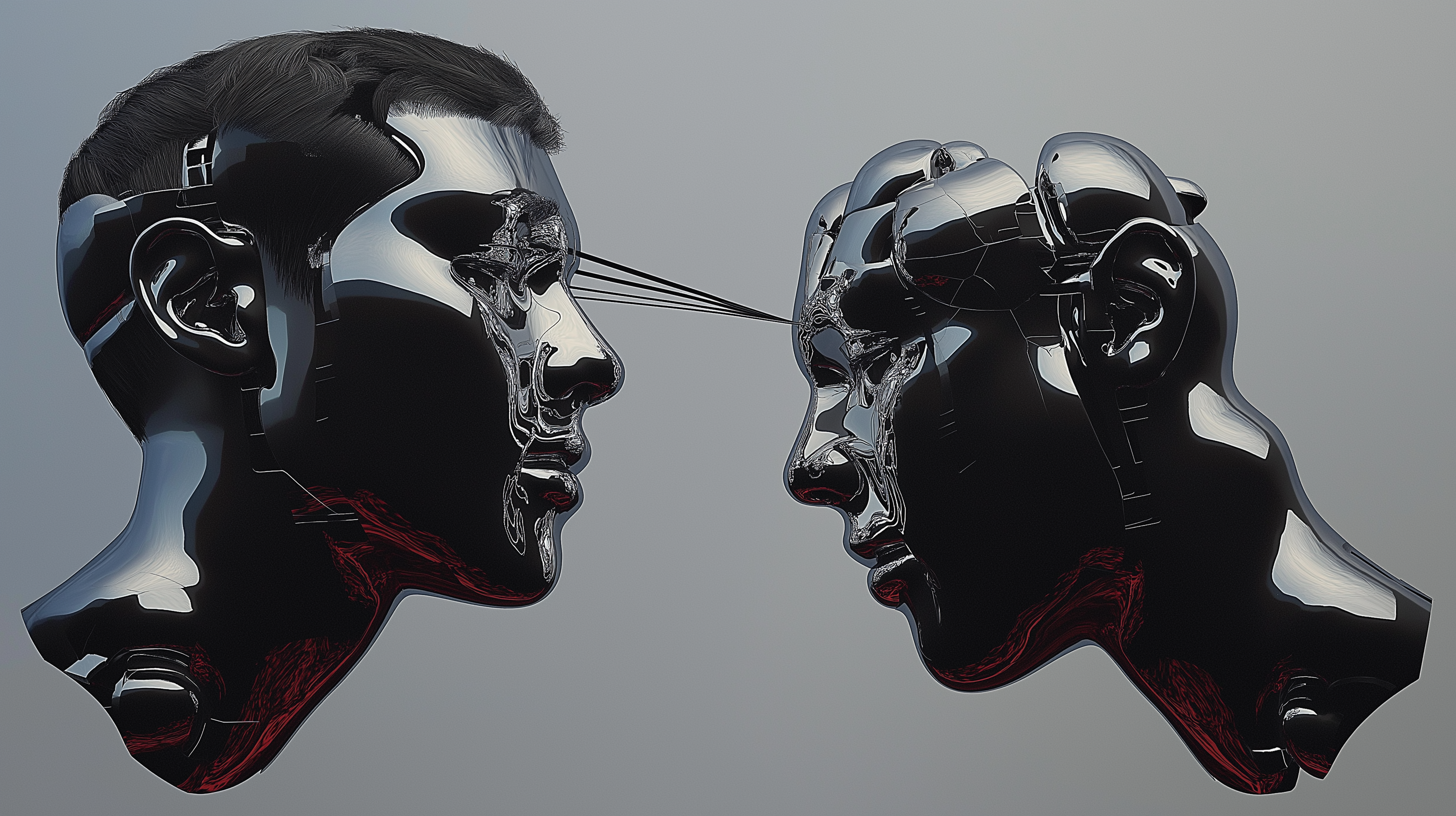 The image portrays a captivating scene featuring a metallic chrome mirrored abstract figure, representing a digital twin, floating in a spacious and minimalistic grey studio. A real person is connected to this digital twin through intricate wires, creating a striking visual contrast and evoking a sense of futuristic connectivity.