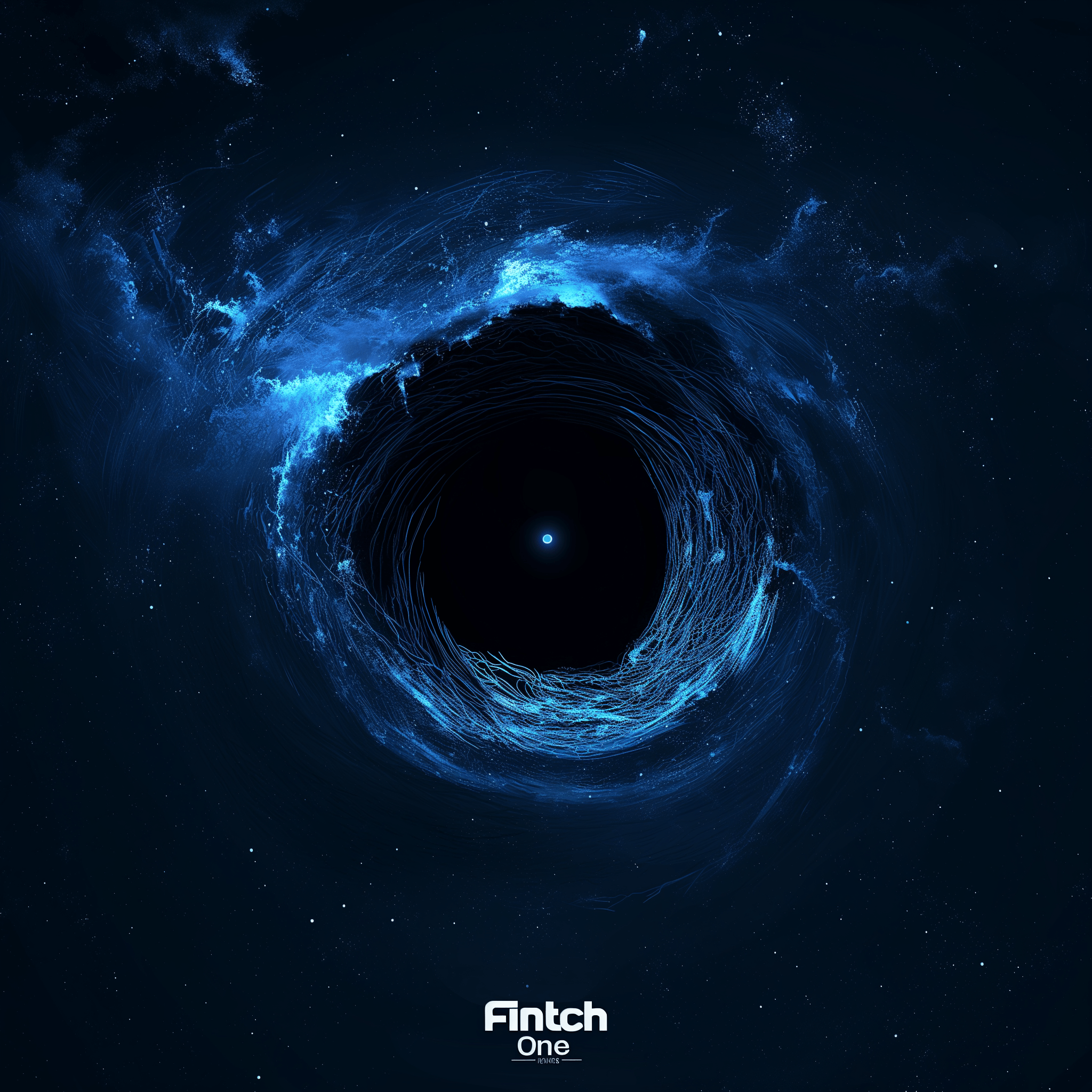 A futuristic and sleek corporate logo design for an iOS application, featuring a supermassive black hole style on a dark blue background.