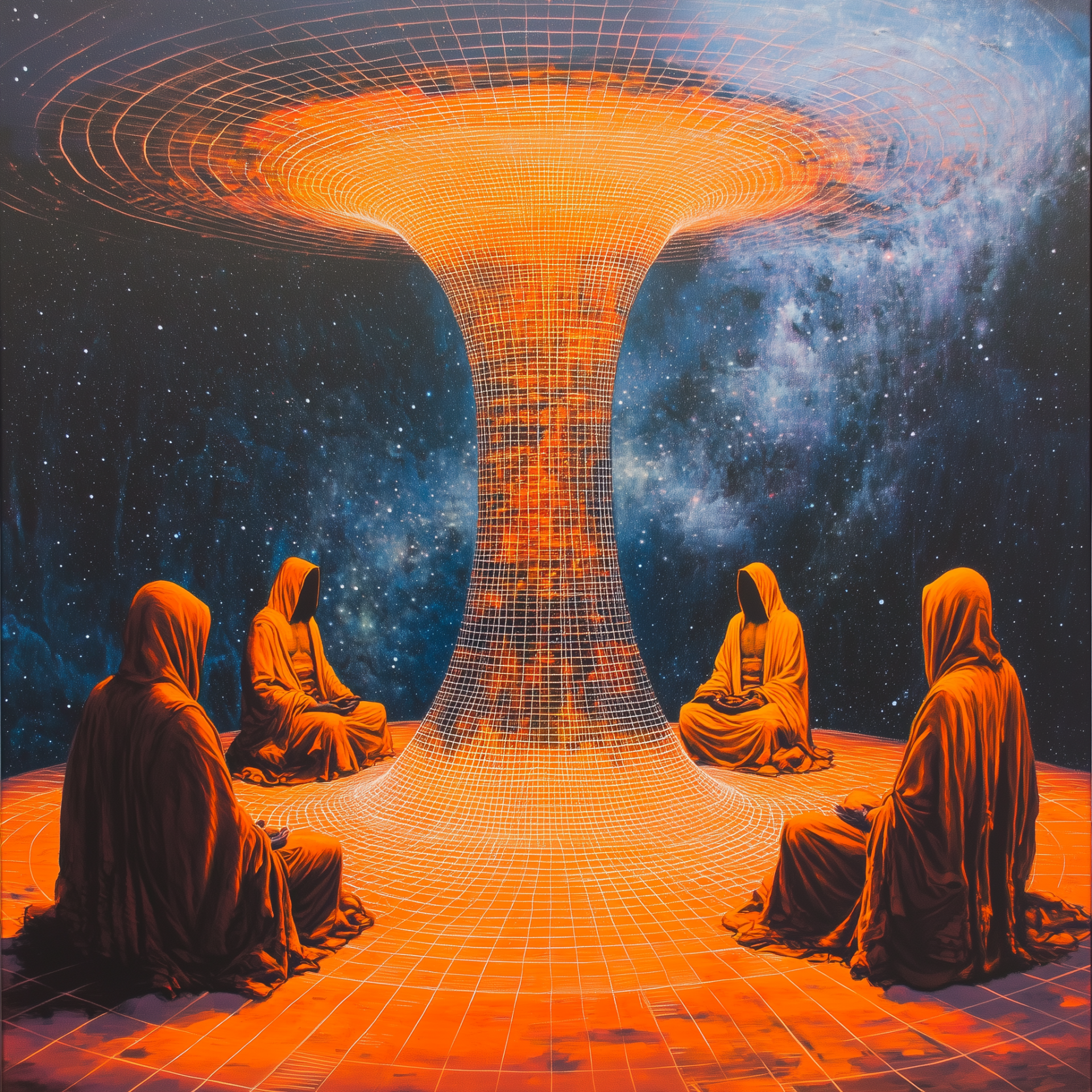 This illustration depicts a mesmerizing wormhole composed of six layers of vibrant dimensions, radiating a glowing grid. Surrounding the central tube are hooded monks, evoking a sense of serenity and mystique, set against a backdrop reminiscent of Tibetan art.