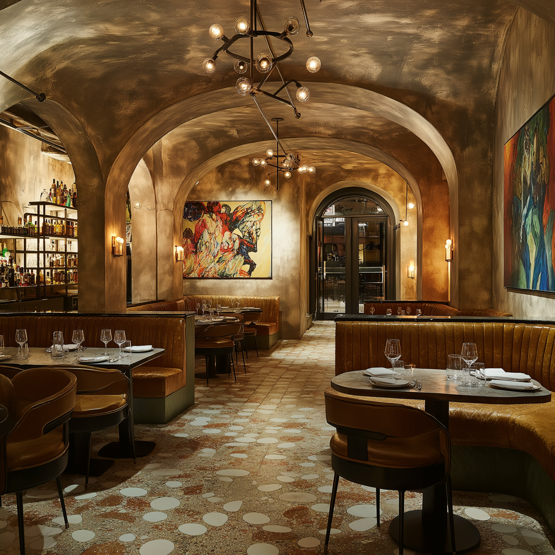 The design features a warm and inviting atmosphere with smooth venetian plaster walls and elegant tiled floors reminiscent of classic European venues. Artistic elements reflect an Italian American members club vibe, infused with stylish artwork to create a sophisticated yet comfortable dining experience.