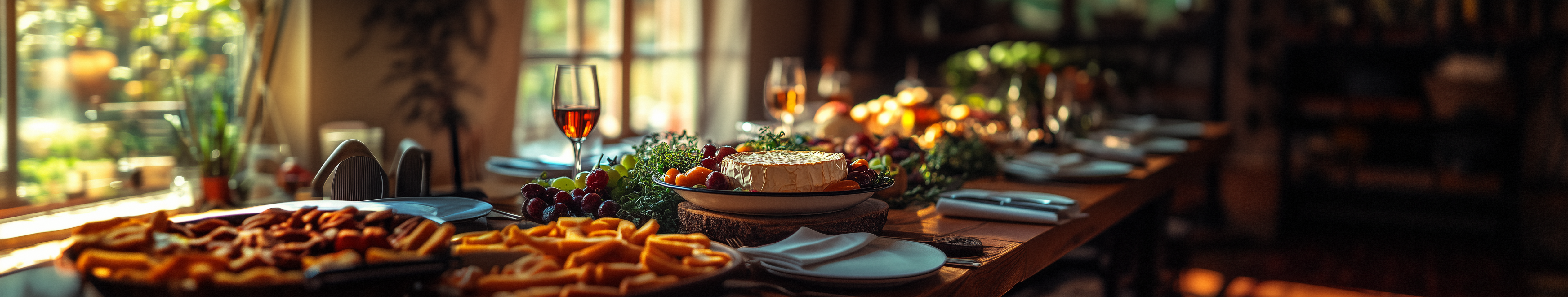 The image showcases a sophisticated restaurant with a beautifully arranged buffet. Delicate Camembert cheese is elegantly displayed on a pristine serving table, contributing to the upscale atmosphere of the elite party.