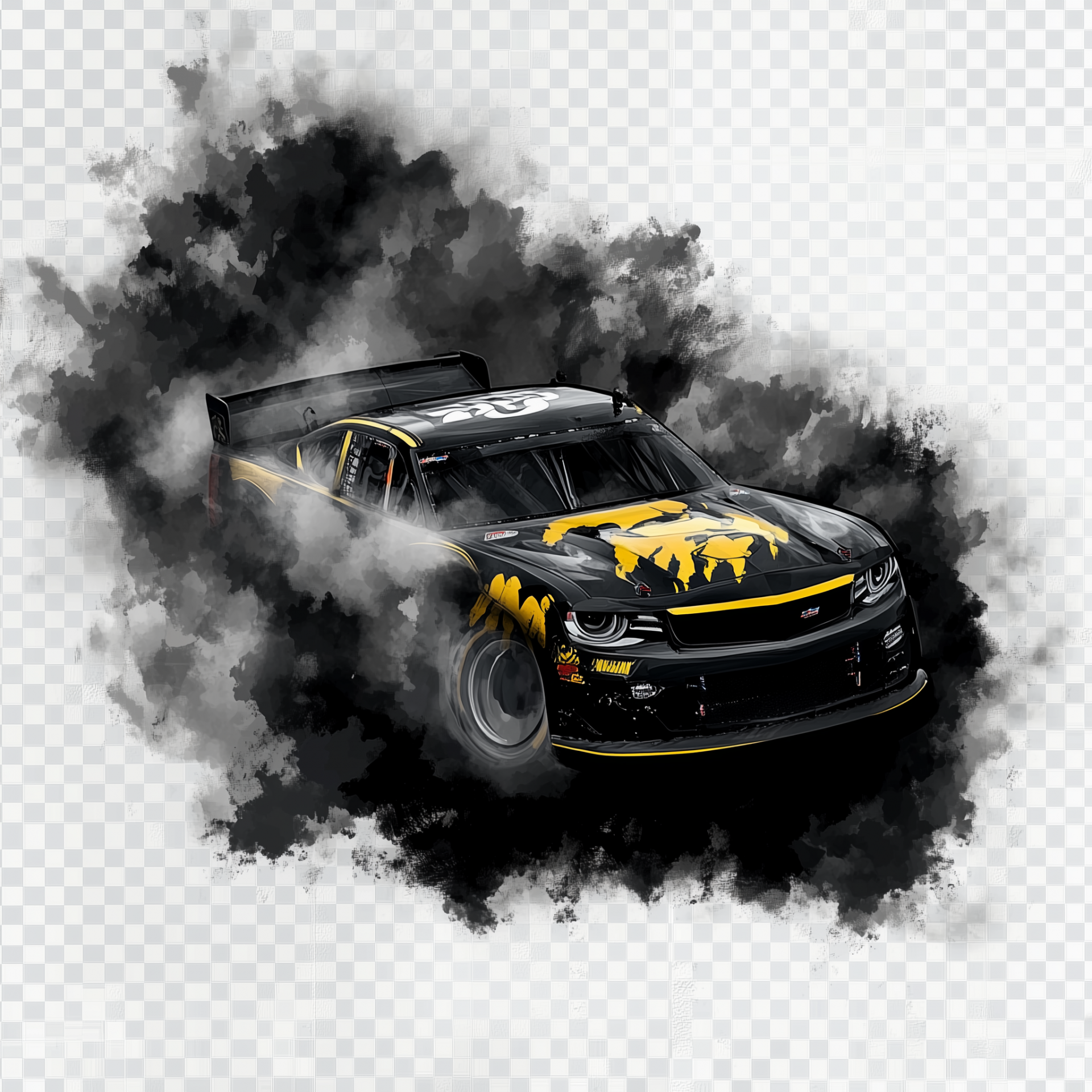This illustration features a classic old-school Disney art style depicting a Black and yellow NASCAR car in a dramatic spin out. The vibrant kush smoke billowing from the tires adds a unique, playful twist to the scene.