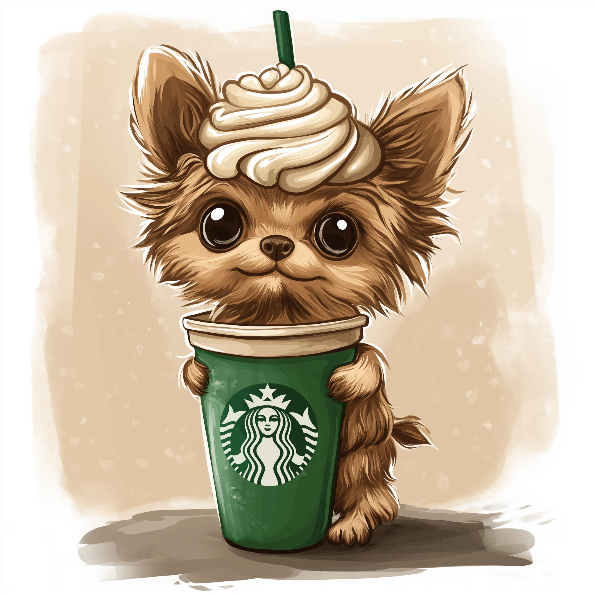 This illustration features a cute chorkie dog adorned in a whimsical costume styled to resemble a whipped coffee drink. The vibrant colors and playful design create a cheerful and fun atmosphere.