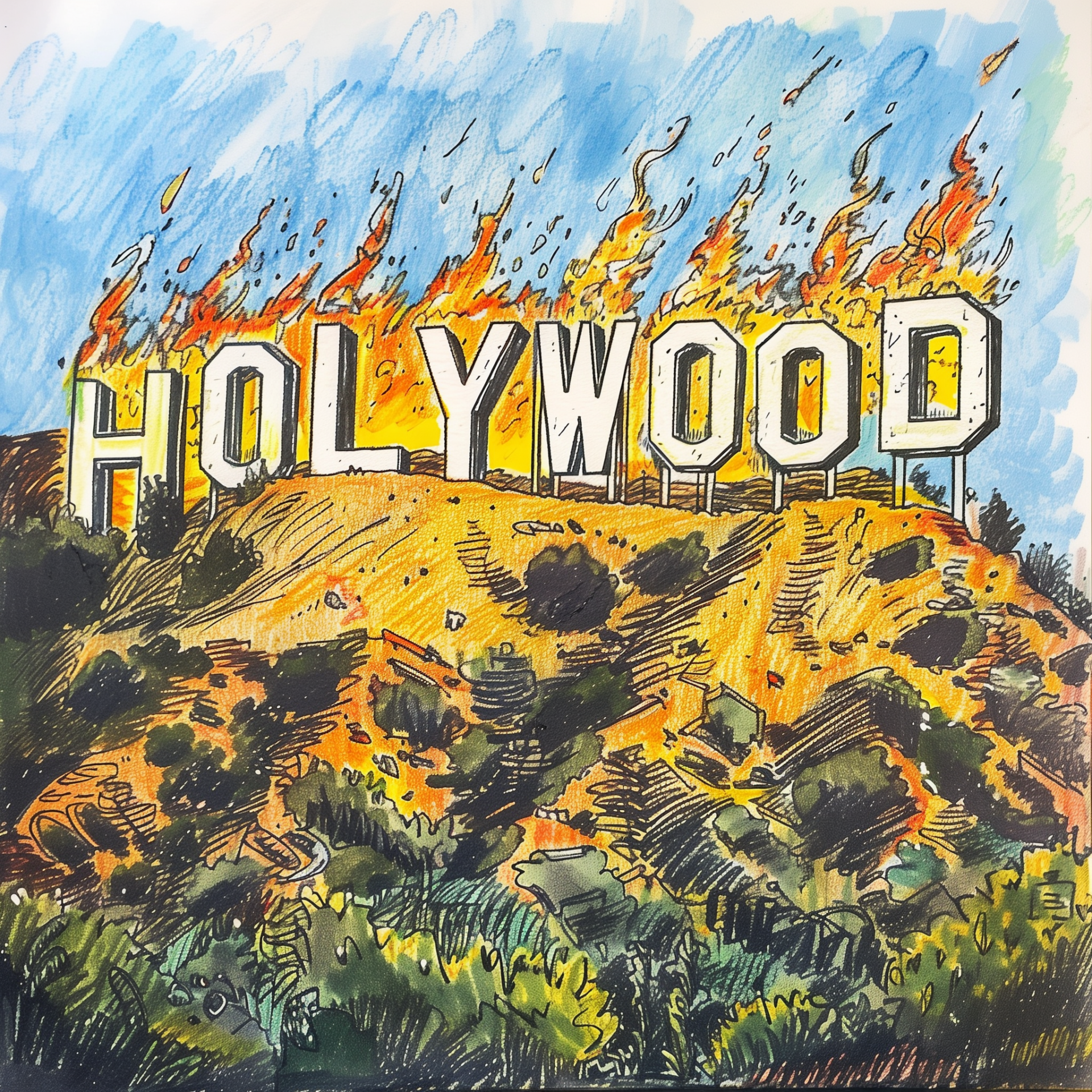 This illustration features a hand drawn interpretation of the iconic Hollywood sign, with a creative twist. The sign is depicted in sharpie marker doodles, set against a white background with vibrant flames surrounding it, giving it a dramatic flair.