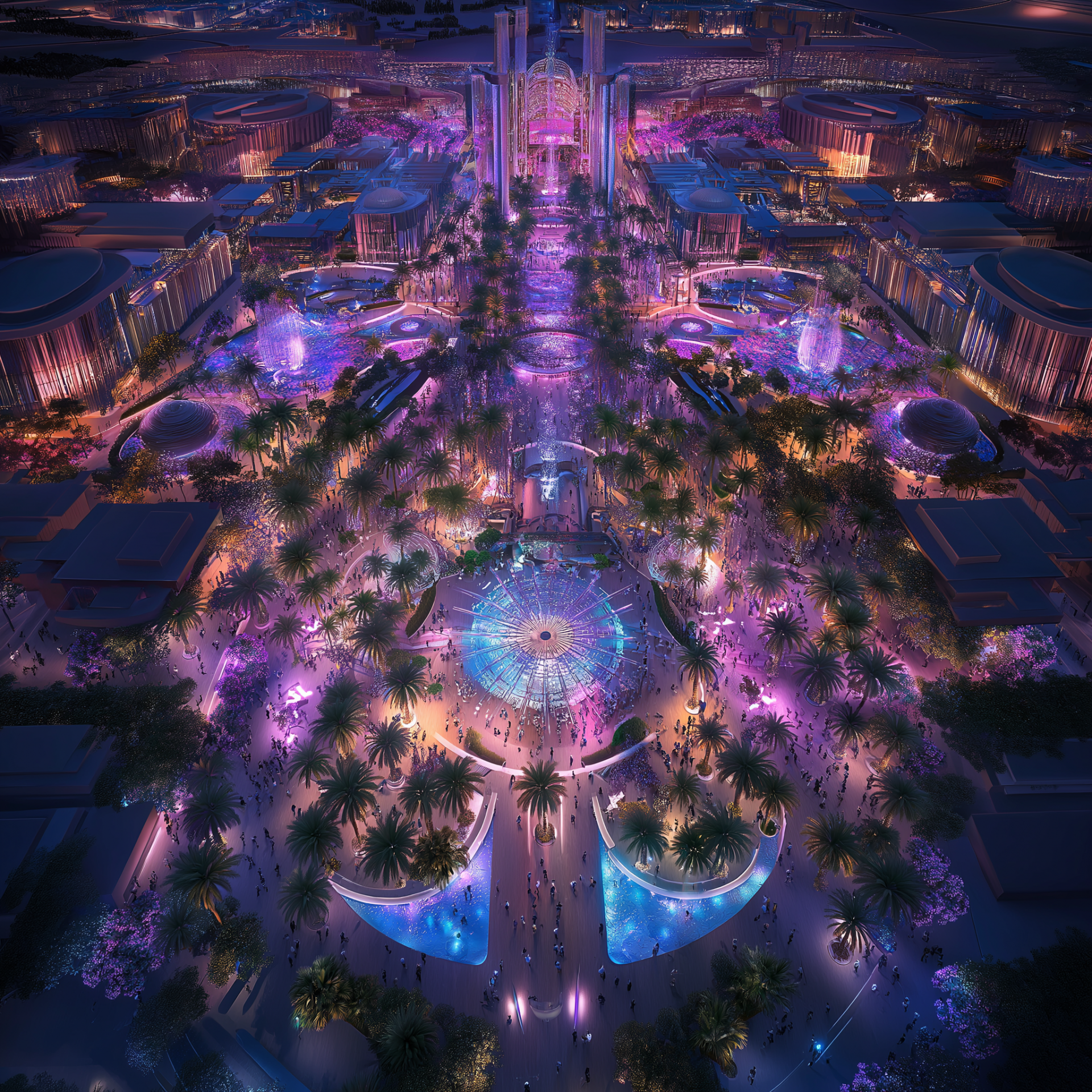 This image features a breathtaking top view of an intricate urban masterplan illuminated by colorful lights during sunset. The layout showcases fluid shapes with lush greenery, palm trees, and a central landmark tower, creating an impressive and vibrant atmosphere.