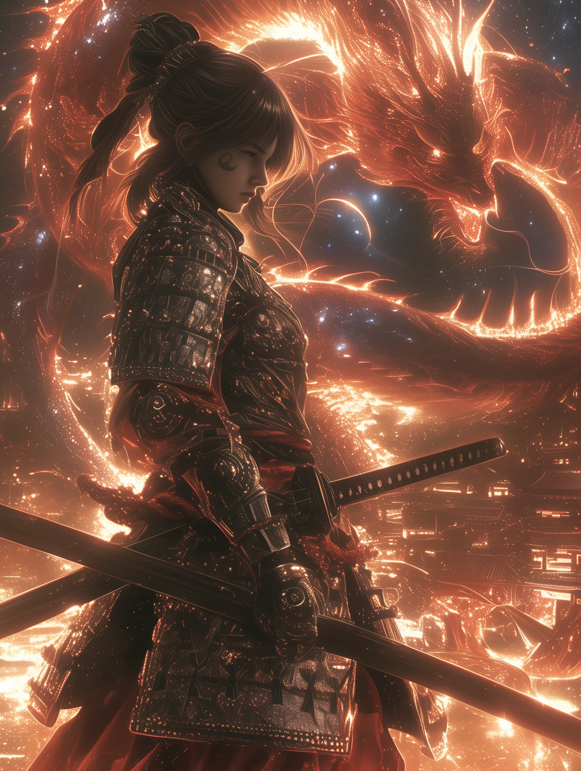 This illustration showcases a hyperrealistic samurai clad in dragon-themed attire, with a sword poised in front of him. The backdrop features a dramatic swirl of galaxies, enhancing the mystical and intense atmosphere of the piece.