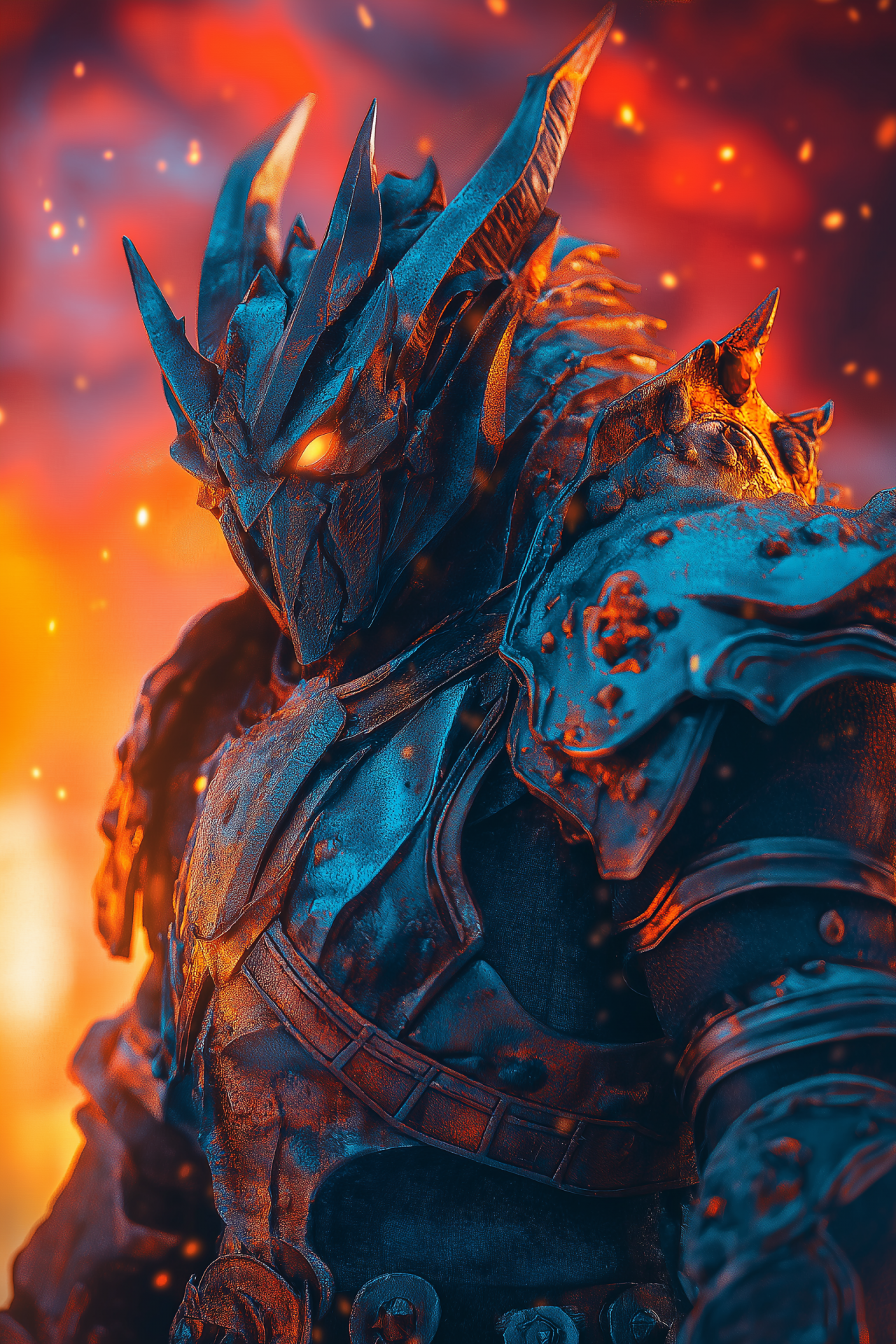 The image depicts a fierce dragon-like figure clad in intricate armor, standing against the backdrop of a vibrant sunset. The futuristic city skyline glows with bright colors, enhancing the dramatic atmosphere.