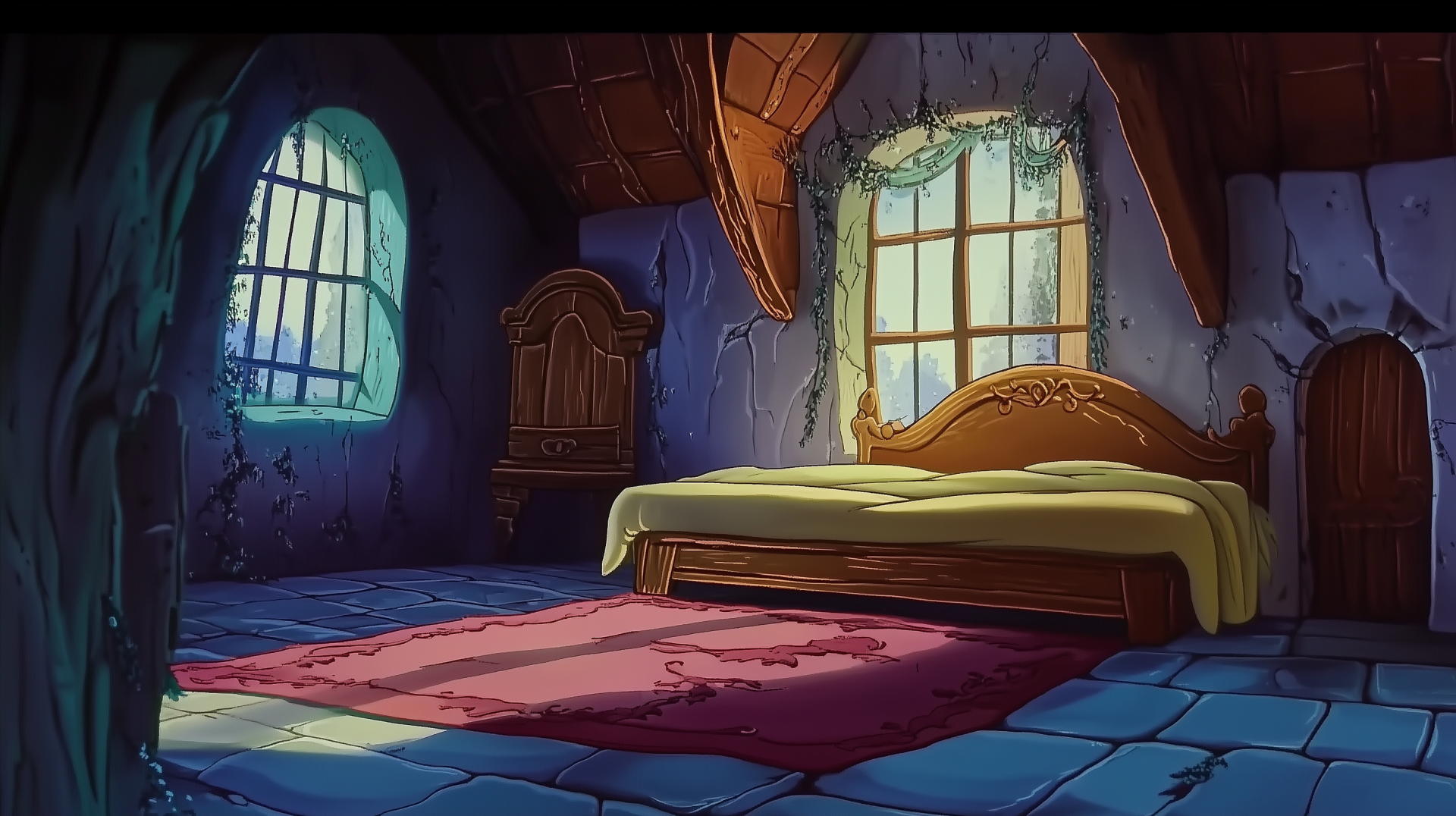 The image depicts a large, cozy bed adorned in a dreamy style that captures the essence of a fairy tale. The background features soft, whimsical art that evokes a sense of warmth and fantasy.