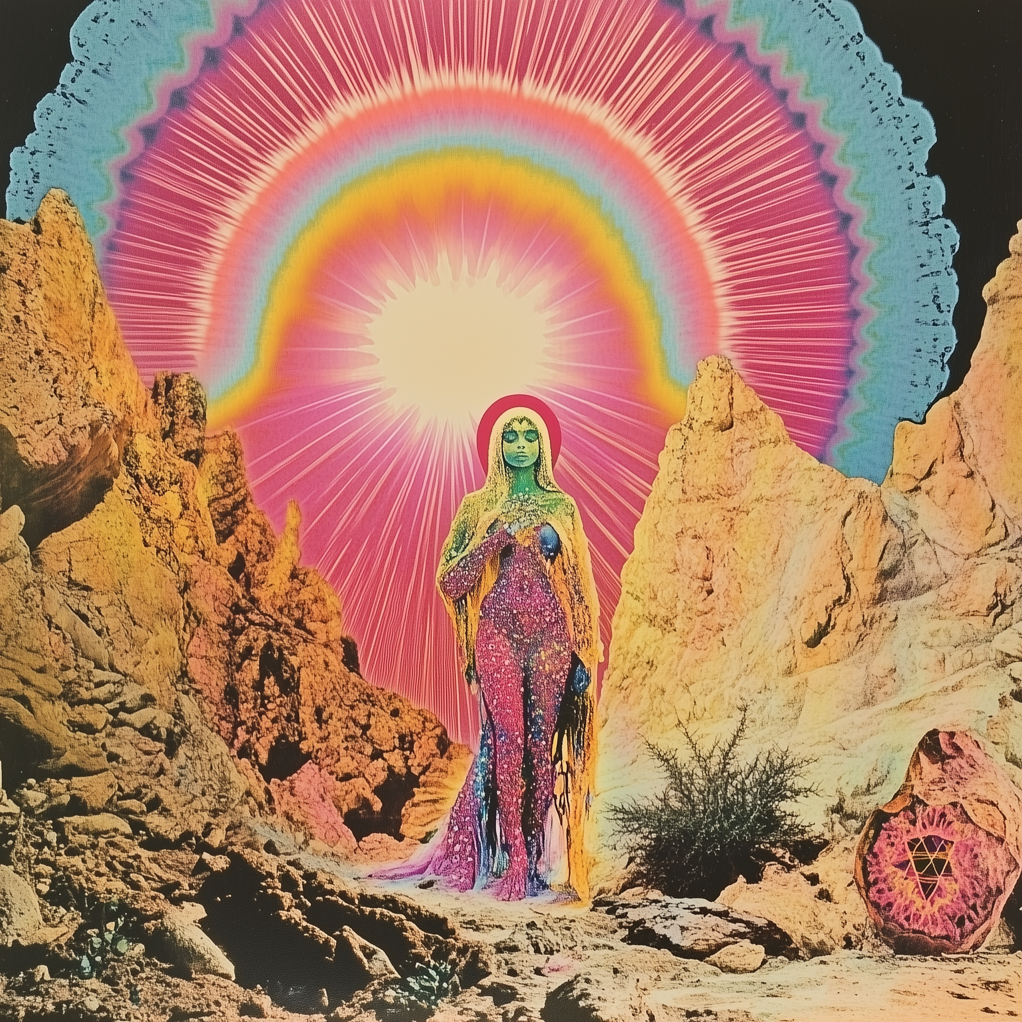 This illustration depicts a formless feminine entity, surrounded by intricate sacred geometry that conveys a sense of safety and guidance. The vibrant, psychedelic colors evoke a dreamlike atmosphere, reminiscent of abstract album covers.