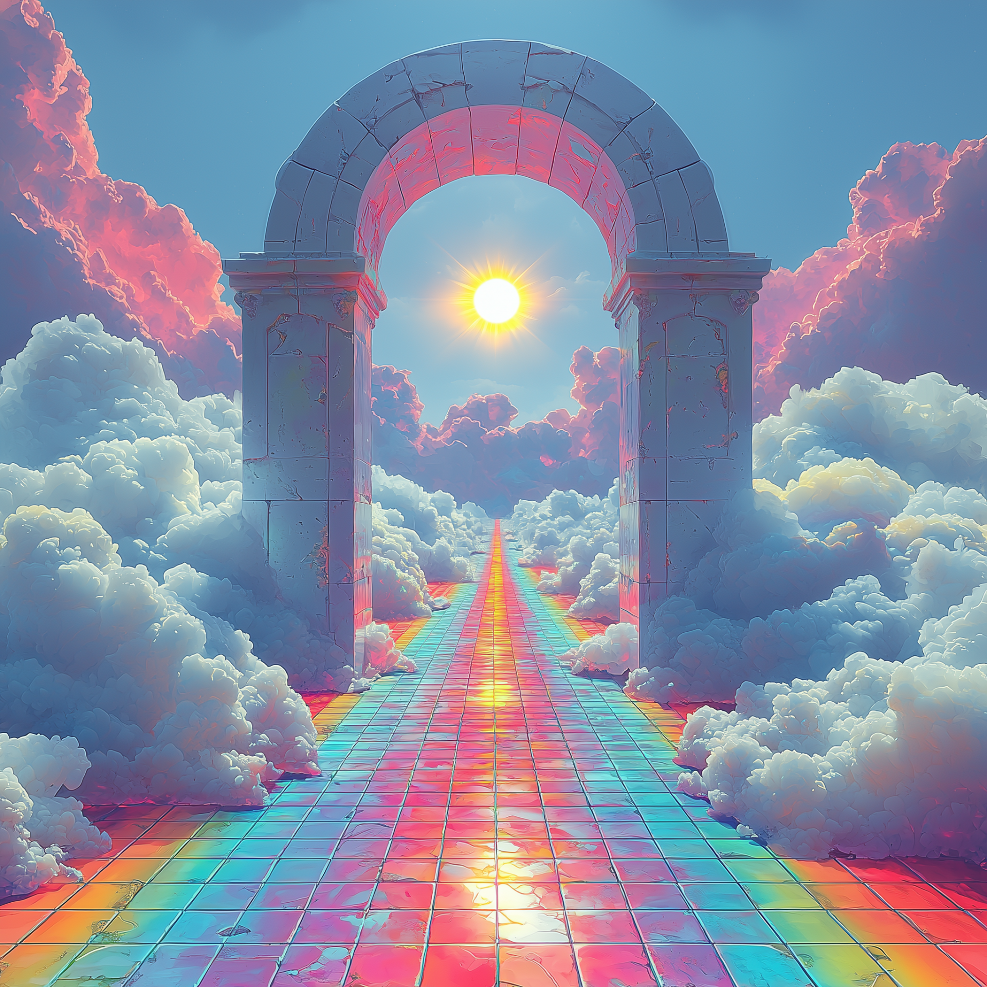 This image showcases a surreal psychedelic landscape filled with vibrant pastel colors and a tiled rainbow road. The ethereal atmosphere is complemented by whimsical clouds and a bright sun, creating a visionary art experience.