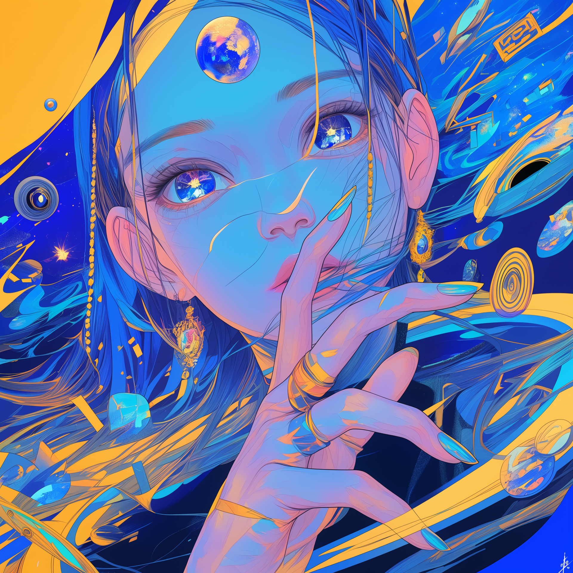 This illustration features a girl with mesmerizing kaleidoscope eyes set against a vibrant wheel of fortune and glowing moon. The surreal and ethereal quality of the colors creates a dreamy atmosphere, pulling the viewer into an imaginative world.