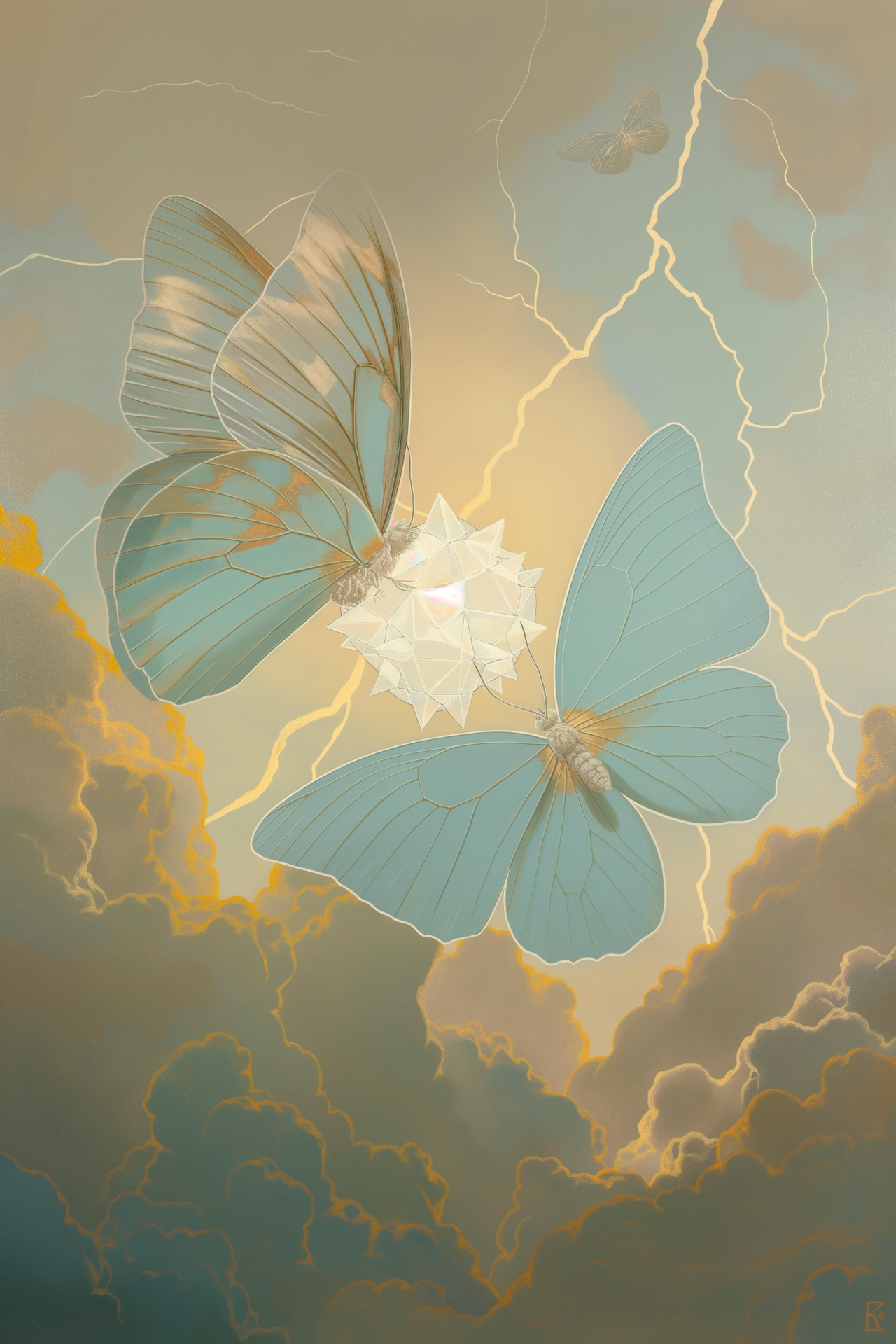 This artwork features two large mirrored butterflies in calming celeste tones, suspended in a pale, dreamy sky. A glowing crystal sphere is positioned elegantly between them, surrounded by yellow lightning and fluffy clouds, creating a clean surreal atmosphere.