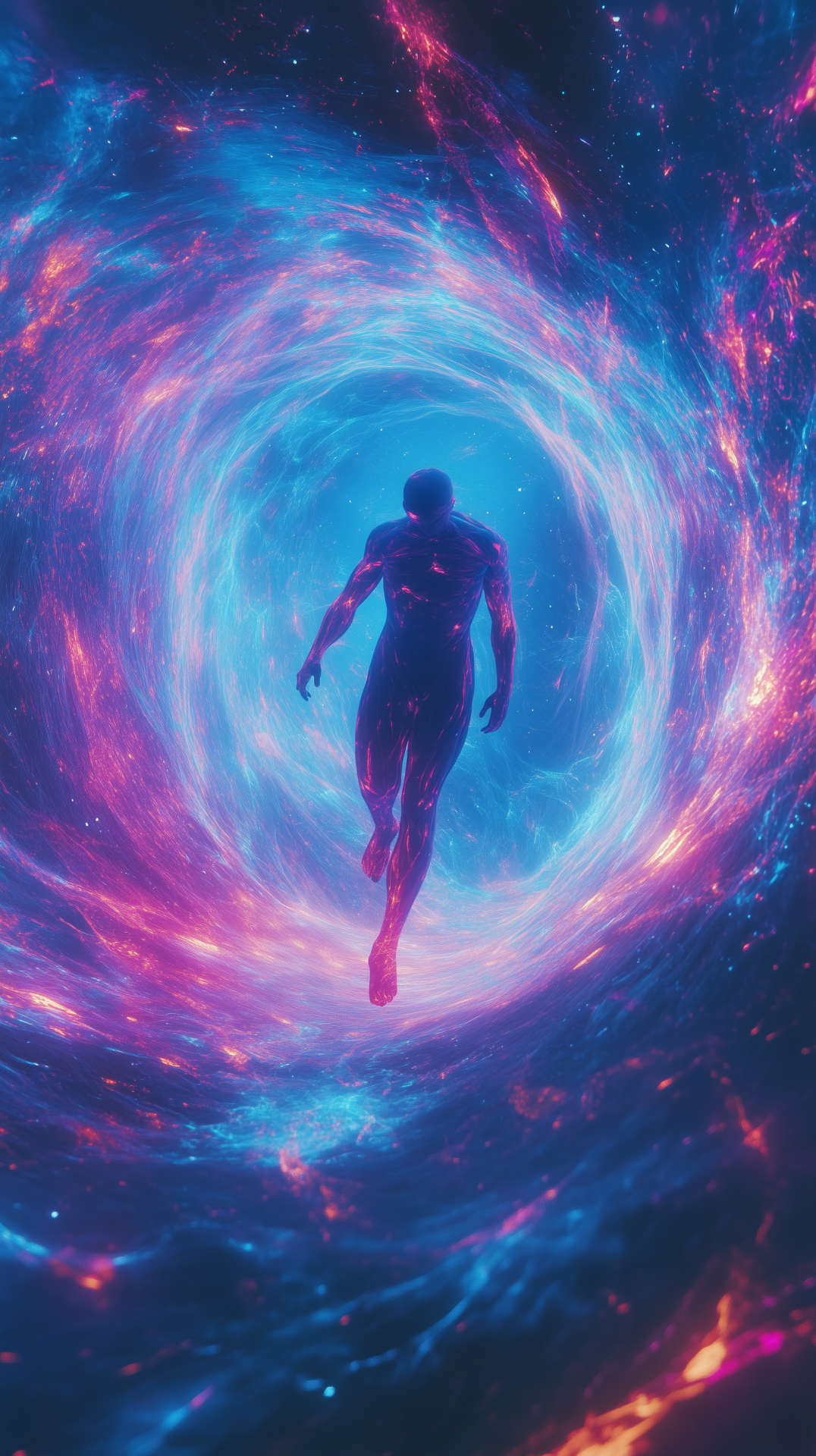 The image showcases a human figure dissolving into a whirlwind of vibrant colors and emotions. Neon hues swirl together, creating an ethereal atmosphere that suggests a dreamlike cosmic journey.