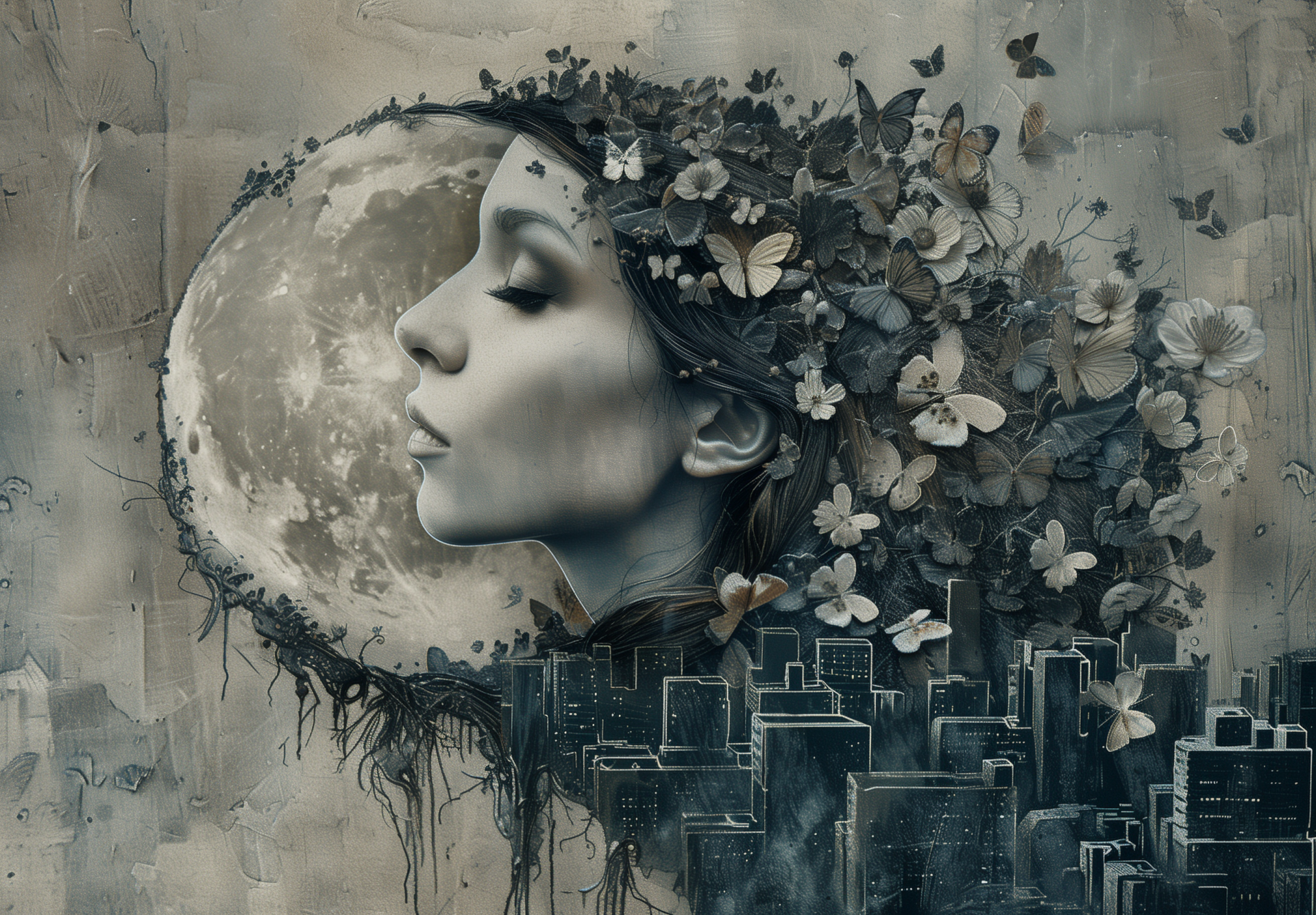 The image features a beautiful woman with hair made of plants and butterflies, her head represented by the moon. In the foreground, an abandoned city is contrasted with small flowers growing on concrete, enhancing the surreal atmosphere.