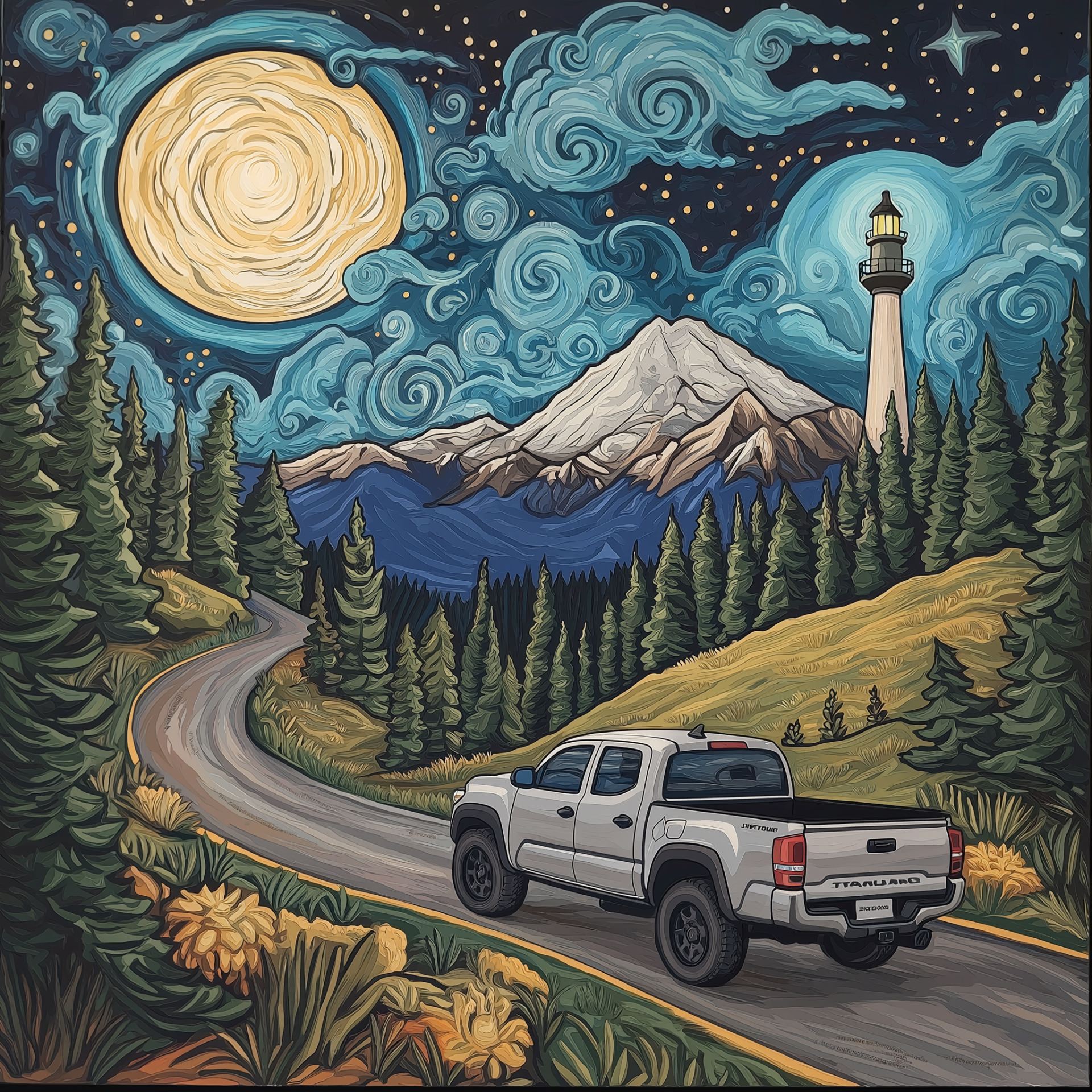 This image features a vibrant and whimsical scene that captures a vehicle navigating a picturesque highway. The artwork blends bohemian colors with a dreamlike atmosphere, showcasing a beautiful night sky filled with stars and a luminous full moon.