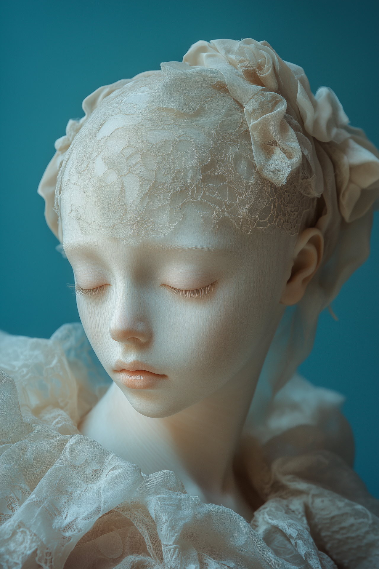 The image features a serene girl with porcelain skin in an elegant dress, gazing down at a bald wooden lace wig. Soft dreamy tones and minimalistic elements create an atmosphere of tranquility and nostalgia.