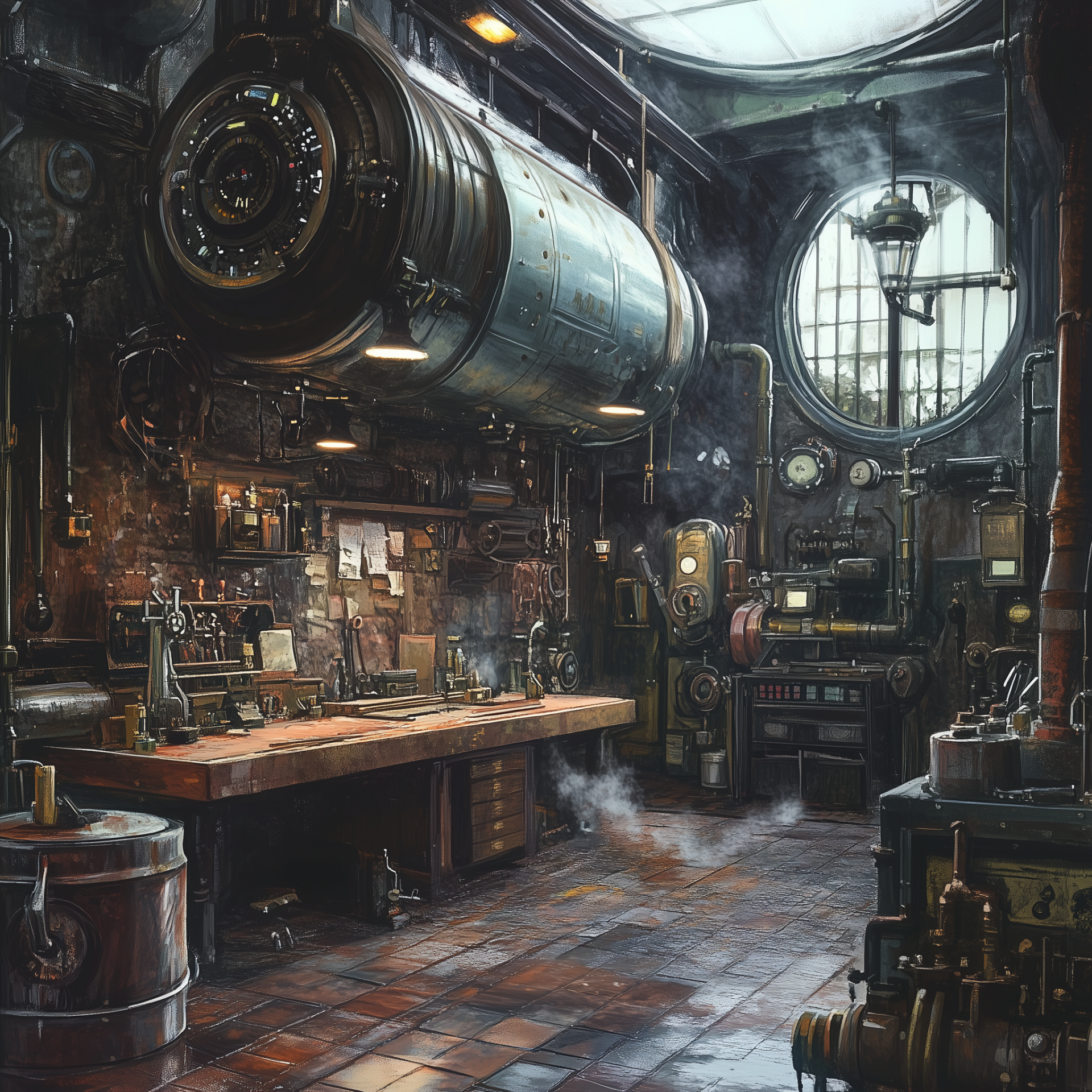This image features a whimsical submarine workshop filled with enchanting industrial elements. The focus is on a sturdy workbench at the center, surrounded by various fantasy tools and gadgets in a sketch style.