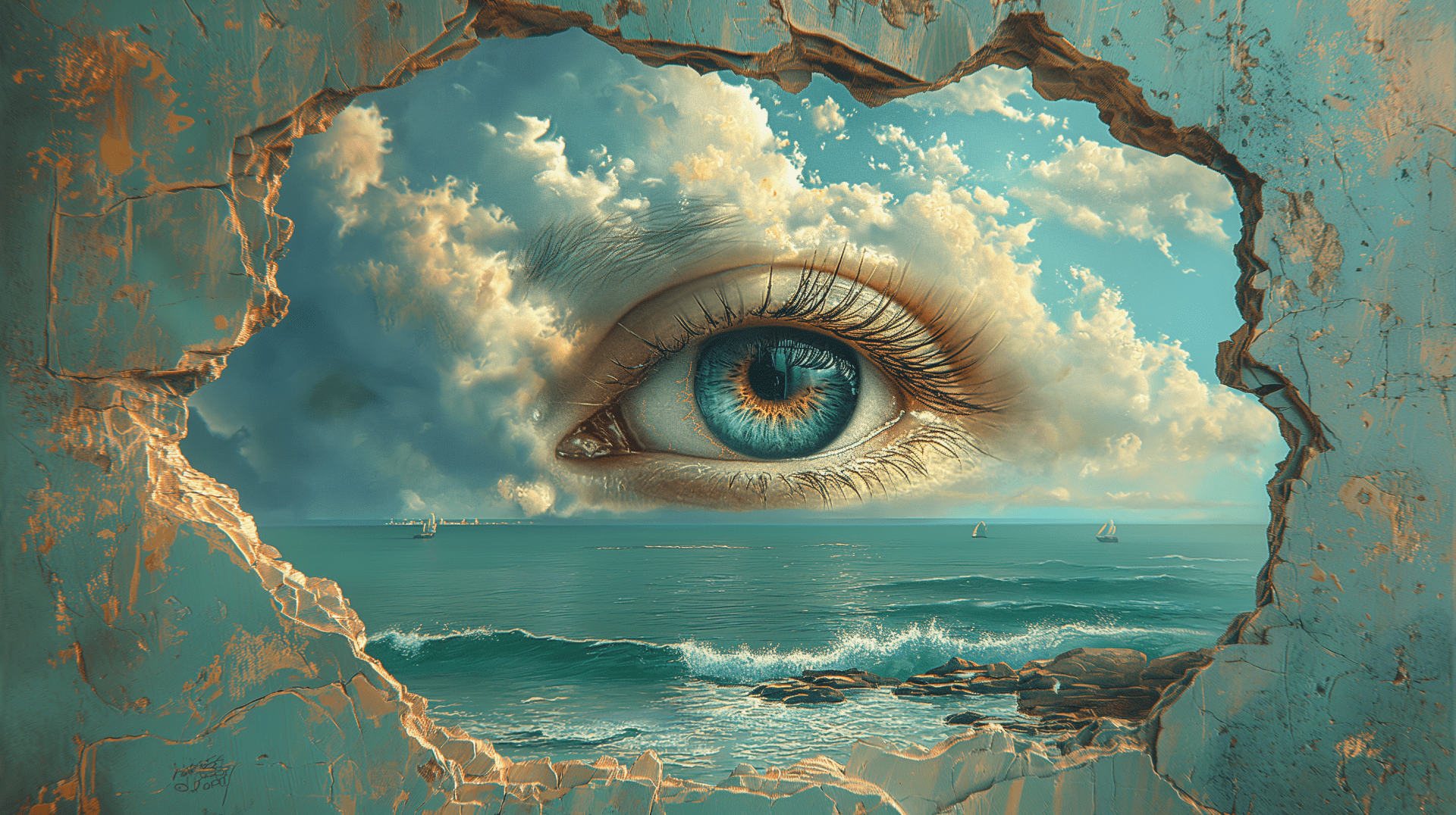 The image depicts a single eye gazing through a crack in a weathered wall, set against a vibrant sky. This surreal composition evokes a sense of curiosity and the unknown, inviting viewers to explore the depths of imagination.