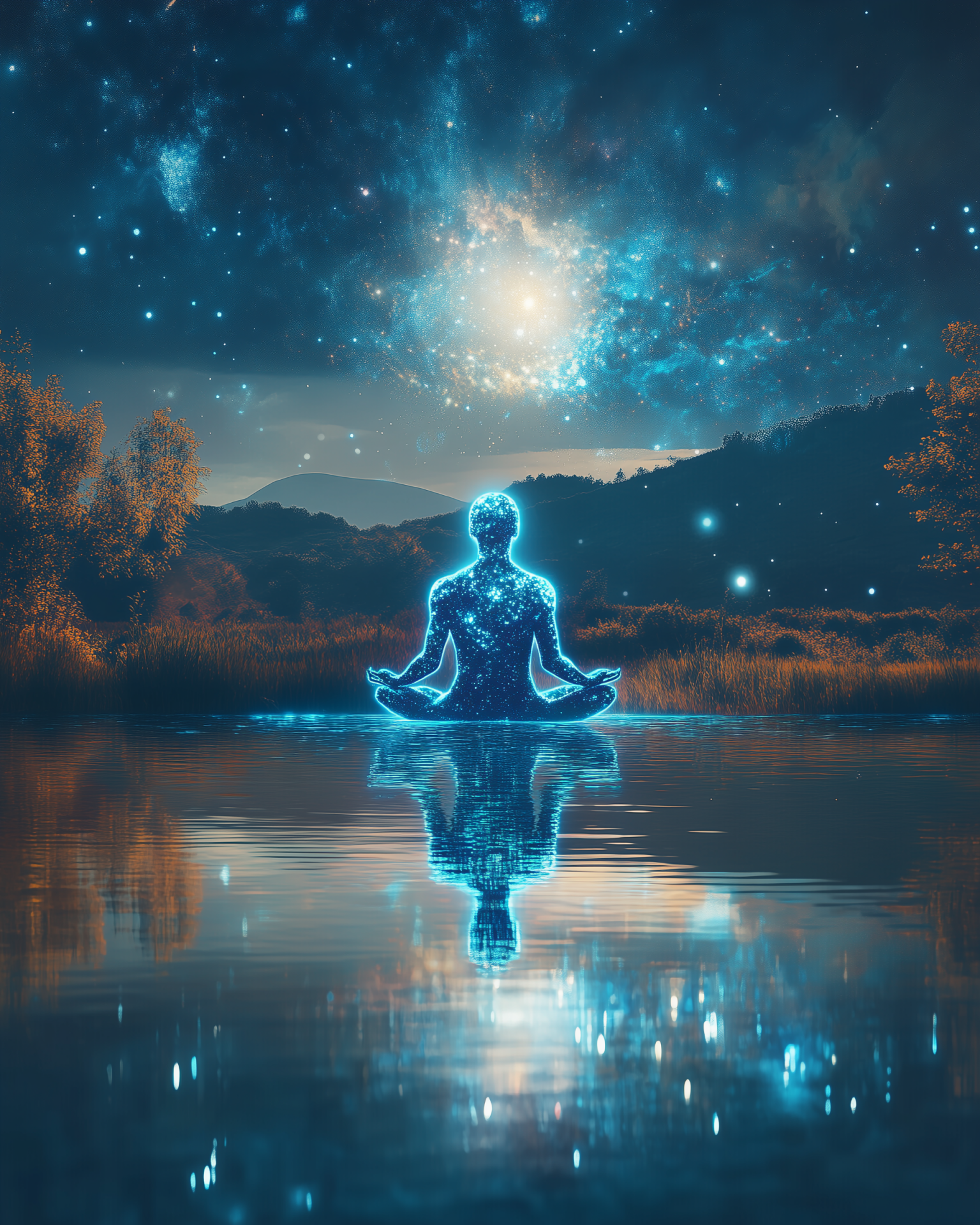 The image depicts a faceless humanoid figure made of glowing blue light sitting at a tranquil lakeside. Its serene reflection in the water, under the full moon and a starry sky, evokes a sense of cosmic peace and harmony.