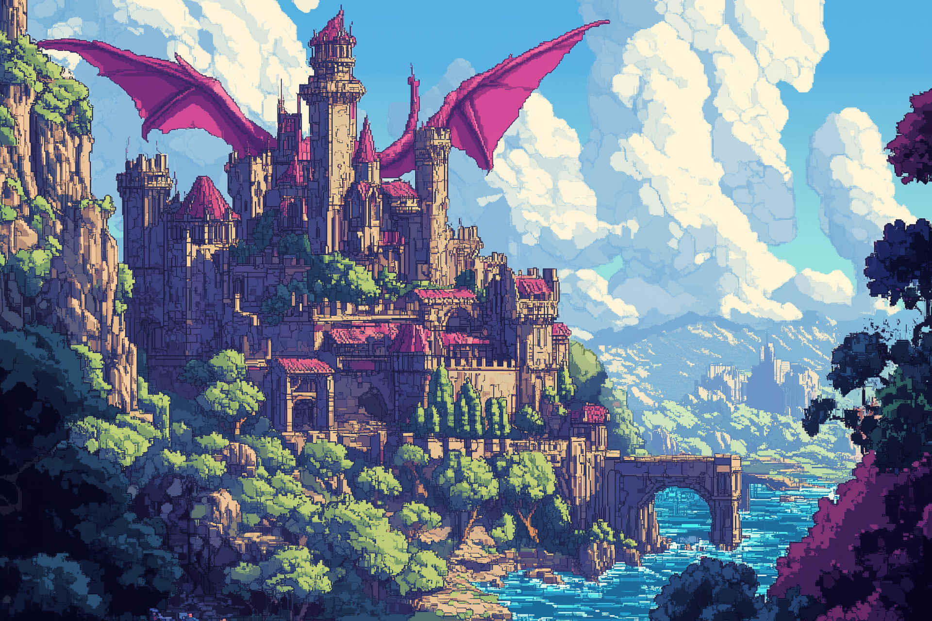 This illustration showcases a vibrant pixel art scene depicting a dragon flying above a majestic castle. The artwork is rich in color and captures the essence of a fantastical RPG world.