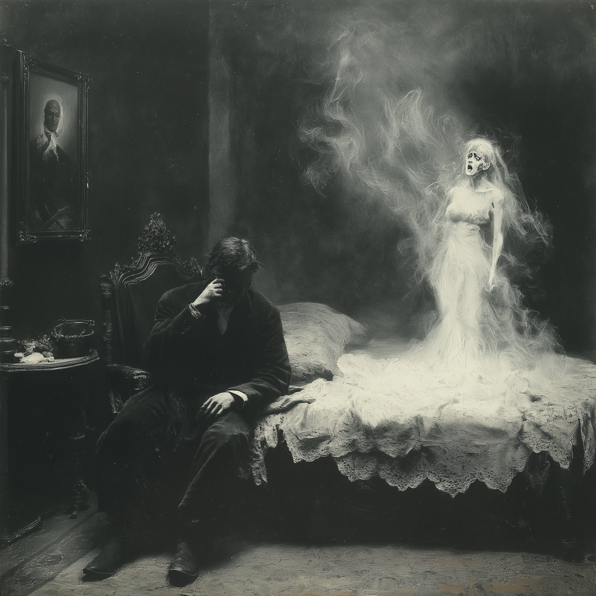 The image depicts a vintage bedroom from the 1800s, where a man sits at the edge of his bed, tears streaming down his face. In the far corner, a ghostly figure of his deceased wife, pale and ethereal, appears to be screaming towards the ceiling, creating an unsettling and surreal atmosphere.